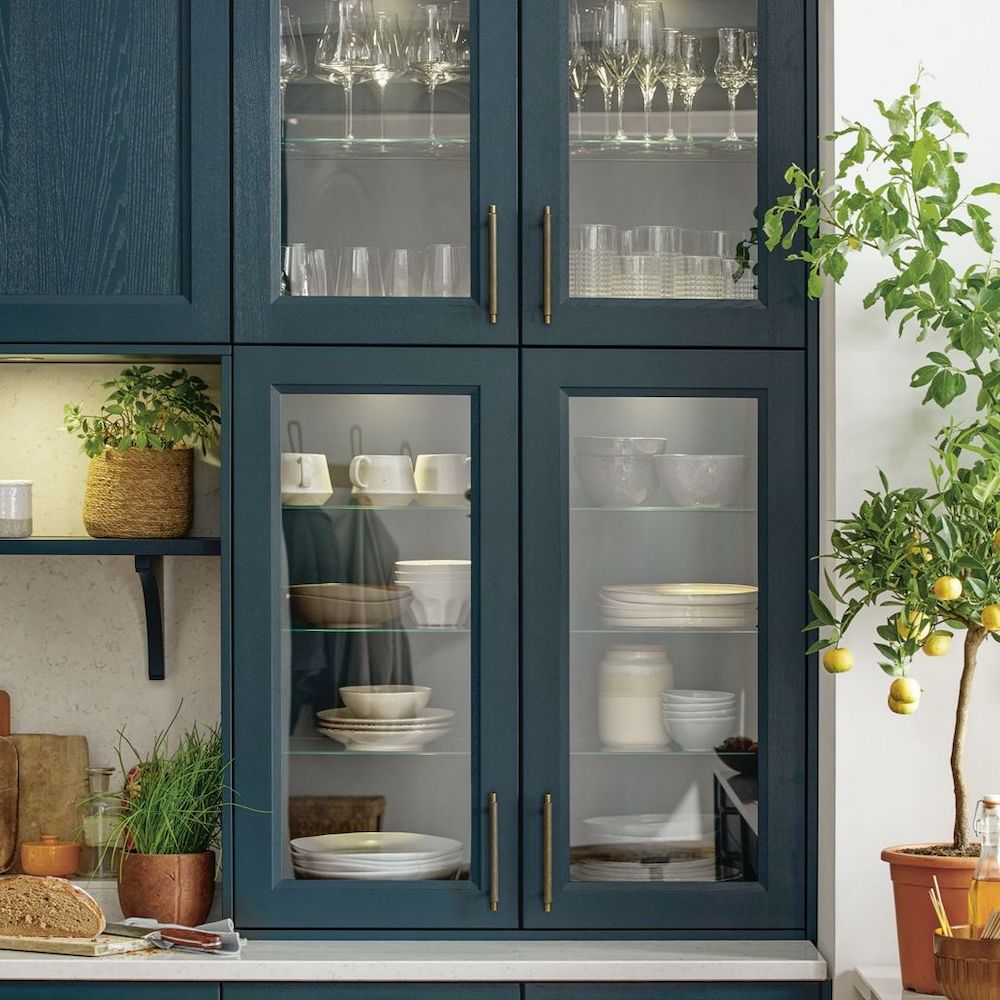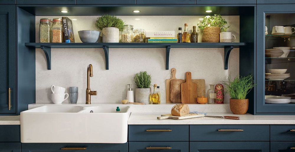 De bijzondere landelijke stijl wordt gedragen door de fronten met diepblauwe satijnlak met nerf, die door de subtiele houtnerf en de stijlvolle messing handgrepen een gevoel van tijdloze behaaglijkheid uitstralen.