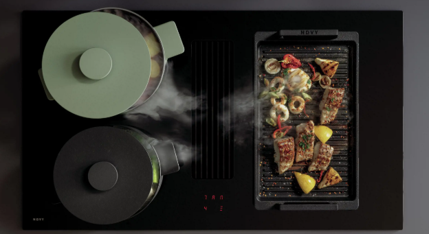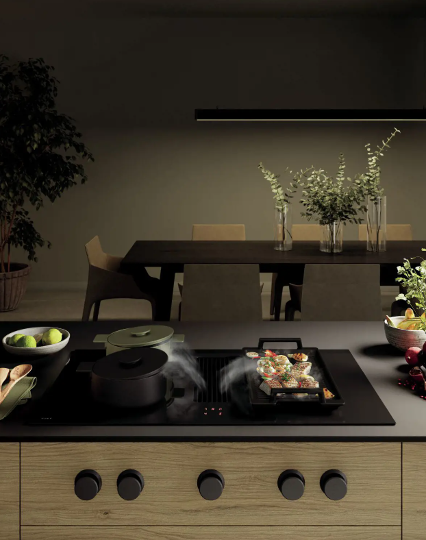 Functionaliteit en stijl worden gecombineerd in deze werkbladafzuiging. De afzuigkap achteraan de kookplaat is verstelbaar in hoogte en afgewerkt in glas.