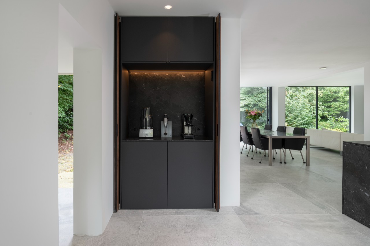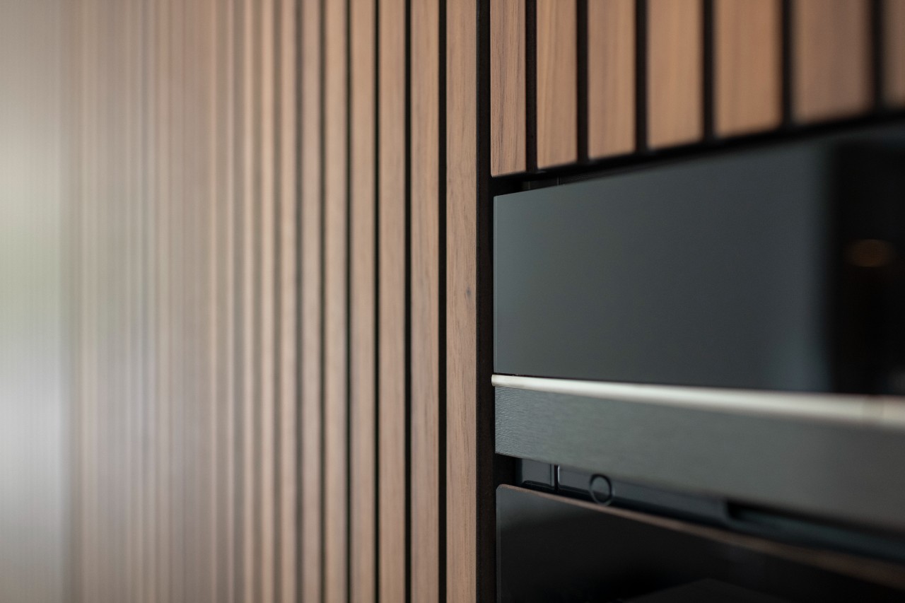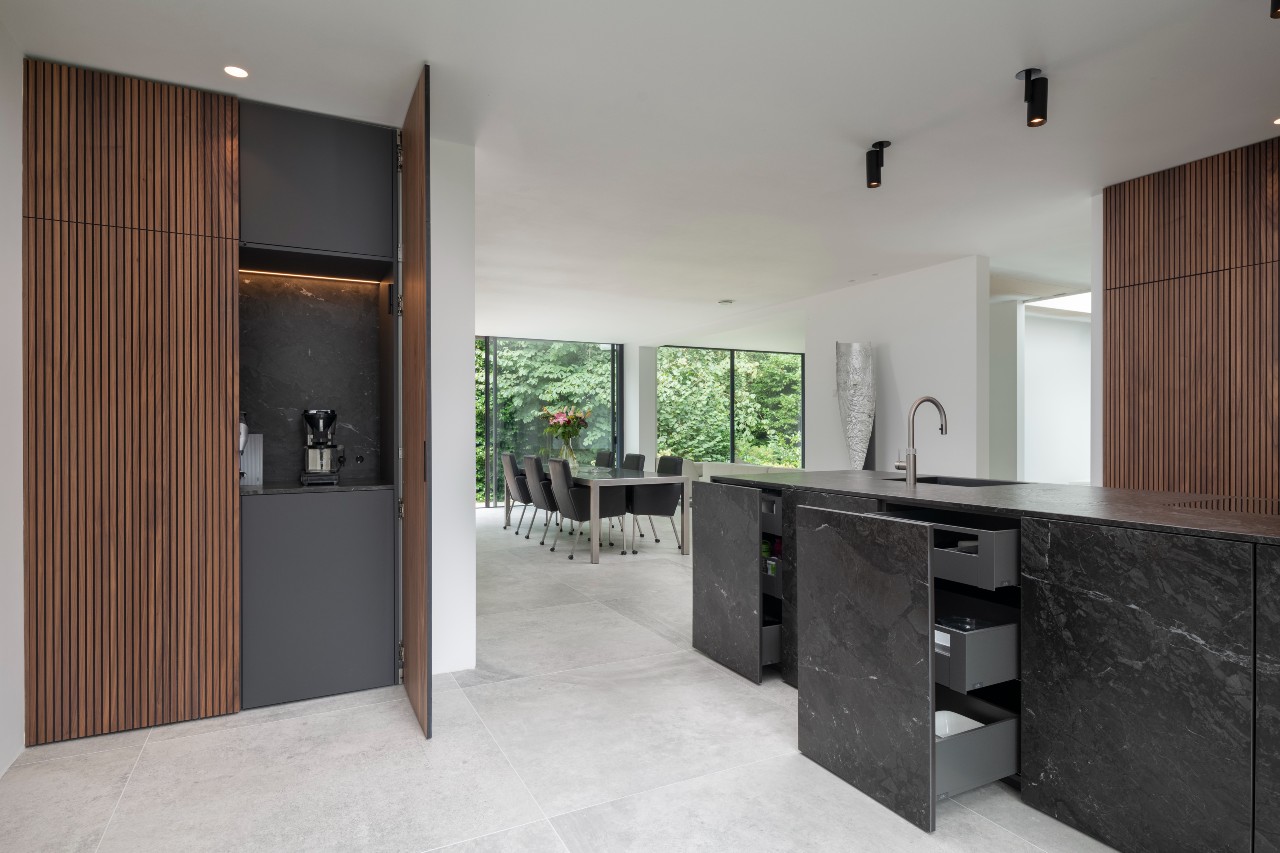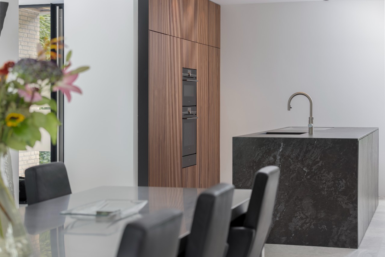Deze prachtige en exclusieve Mereno keuken heeft een moderne look en feel. Dit komt niet alleen door de opvallende kastenwand maar wordt ook stijlvol door de greeploze fronten. De combinatie van materialen en structuren zorgen ervoor dat de keuken ondanks zijn strakke design, sfeervol en warm blijft.