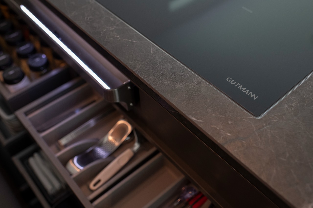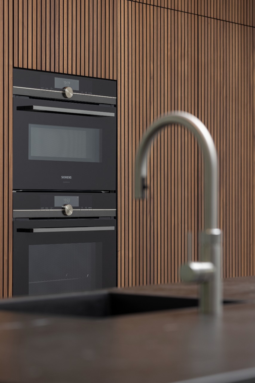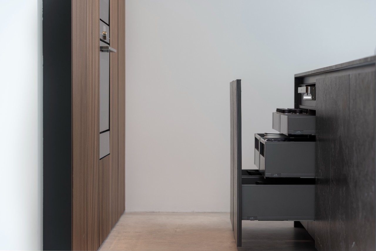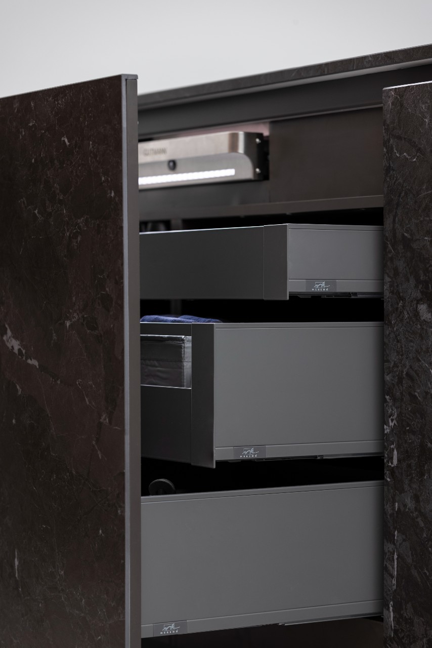 Deze prachtige en exclusieve Mereno keuken heeft een moderne look en feel. Dit komt niet alleen door de opvallende kastenwand maar wordt ook stijlvol door de greeploze fronten. De combinatie van materialen en structuren zorgen ervoor dat de keuken ondanks zijn strakke design, sfeervol en warm blijft.