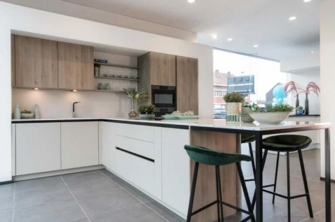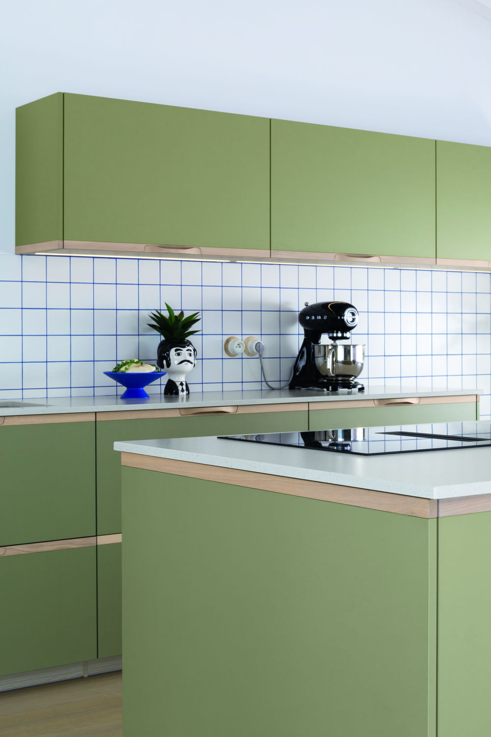 ©Mobalpa - Mercure 2024De eenvoud van witte tegels komt tot leven door de opvallende elektrisch blauwe voegen, die een sterk contrast vormen met het licht olijfgroene van de boven- en onderkasten. Het hoogtepunt van de kamer, het keukeneiland, nodigt uit tot gezelligheid en samenkomen. Het herbergt de kookplaat op een zeer elegant gerecycled stenen werkblad van een uniek mineraal ‘Pierredeplan’. Met opslag aan beide zijden biedt het een aanzienlijke ruimtewinst. Het blok kasten, geflankeerd door open nisjes, huisvest een functionele kruidenierskast uitgerust met drie schuifladen. De open uitsparingen rondom bieden ruimte voor lijsten, vazen, planten... Een interessante combinatie voor een luchtige uitstraling.