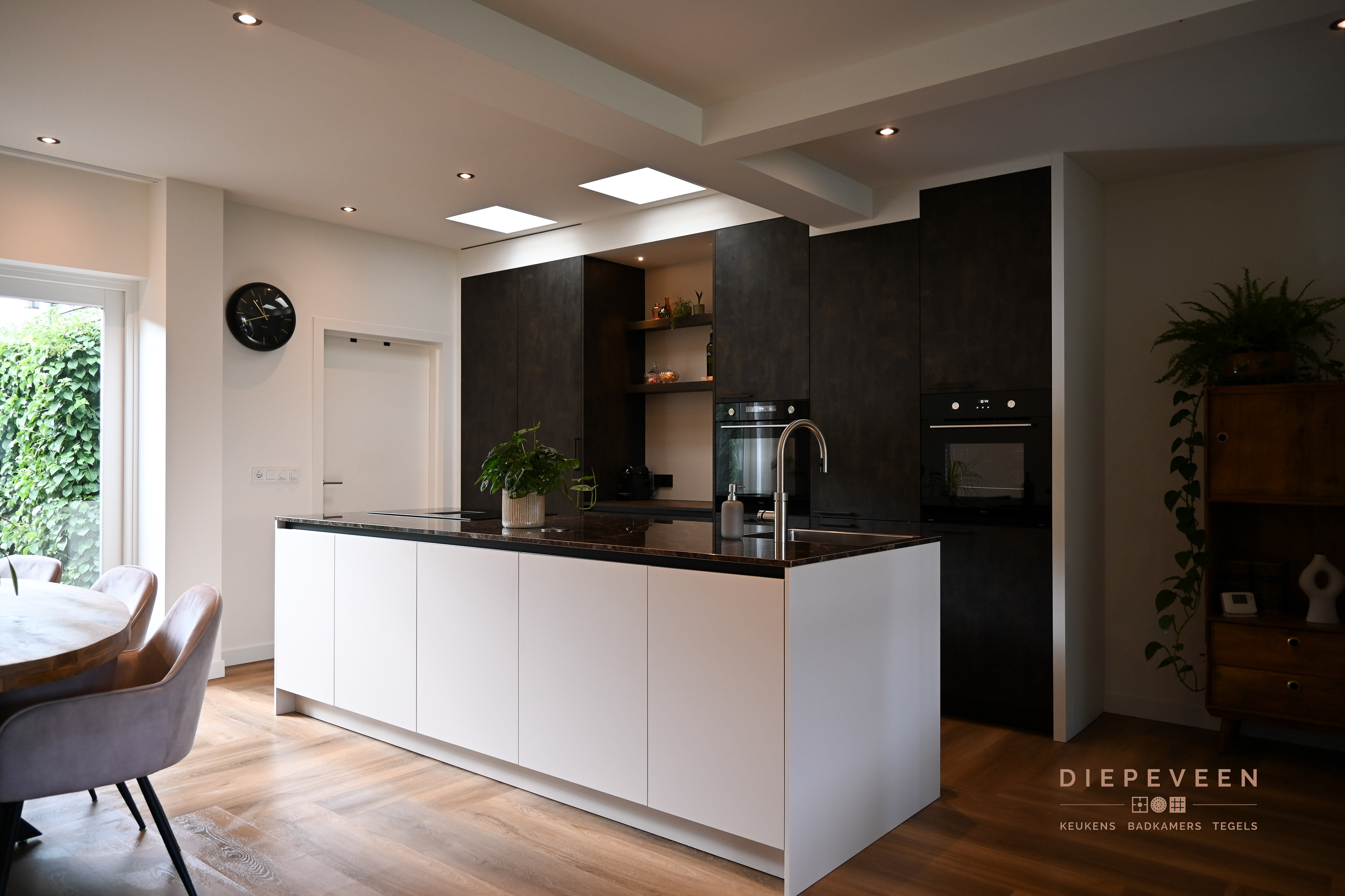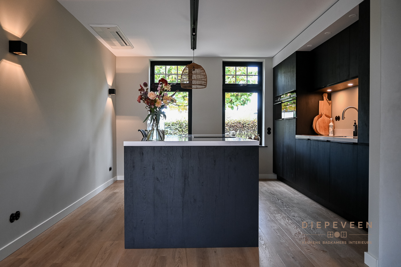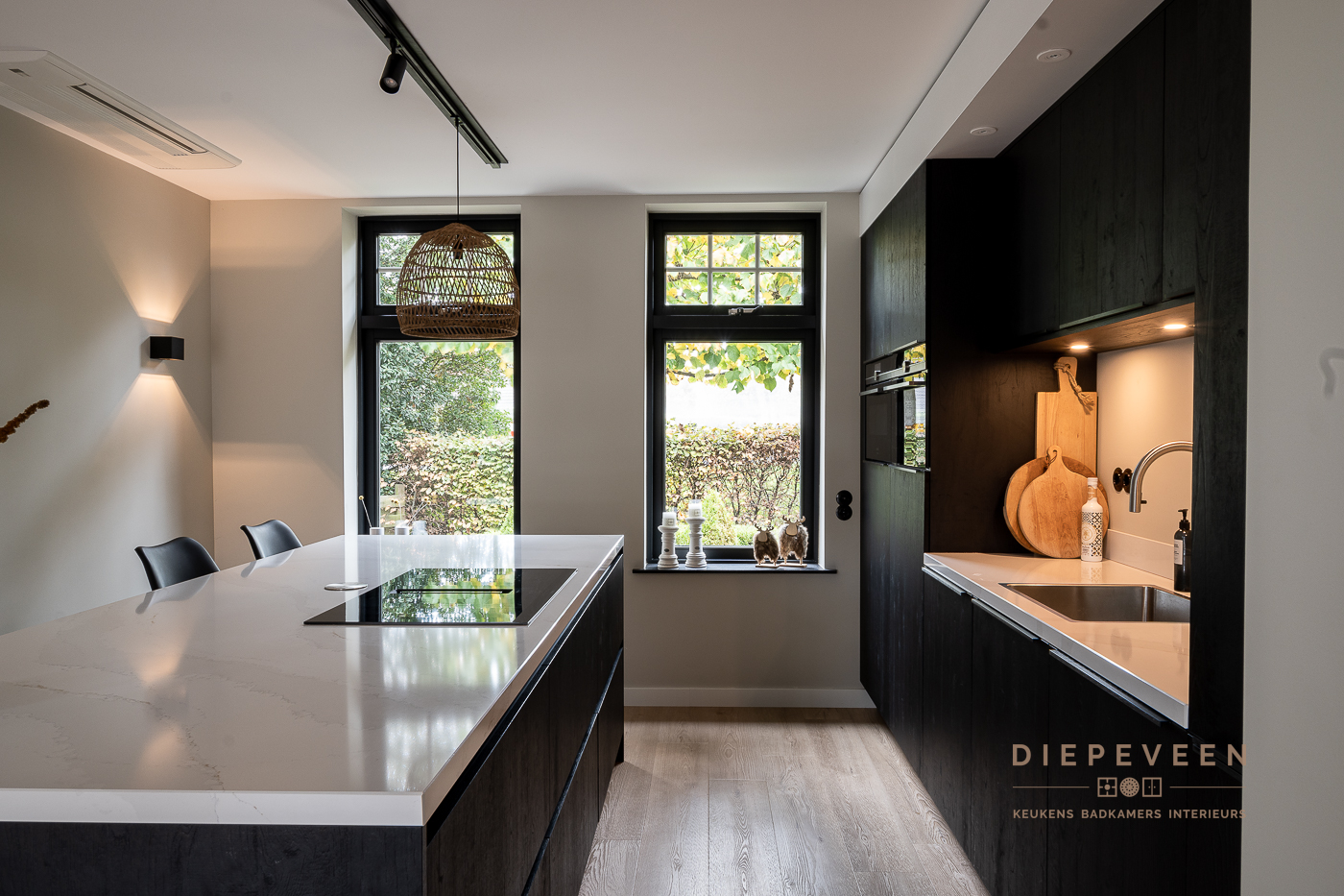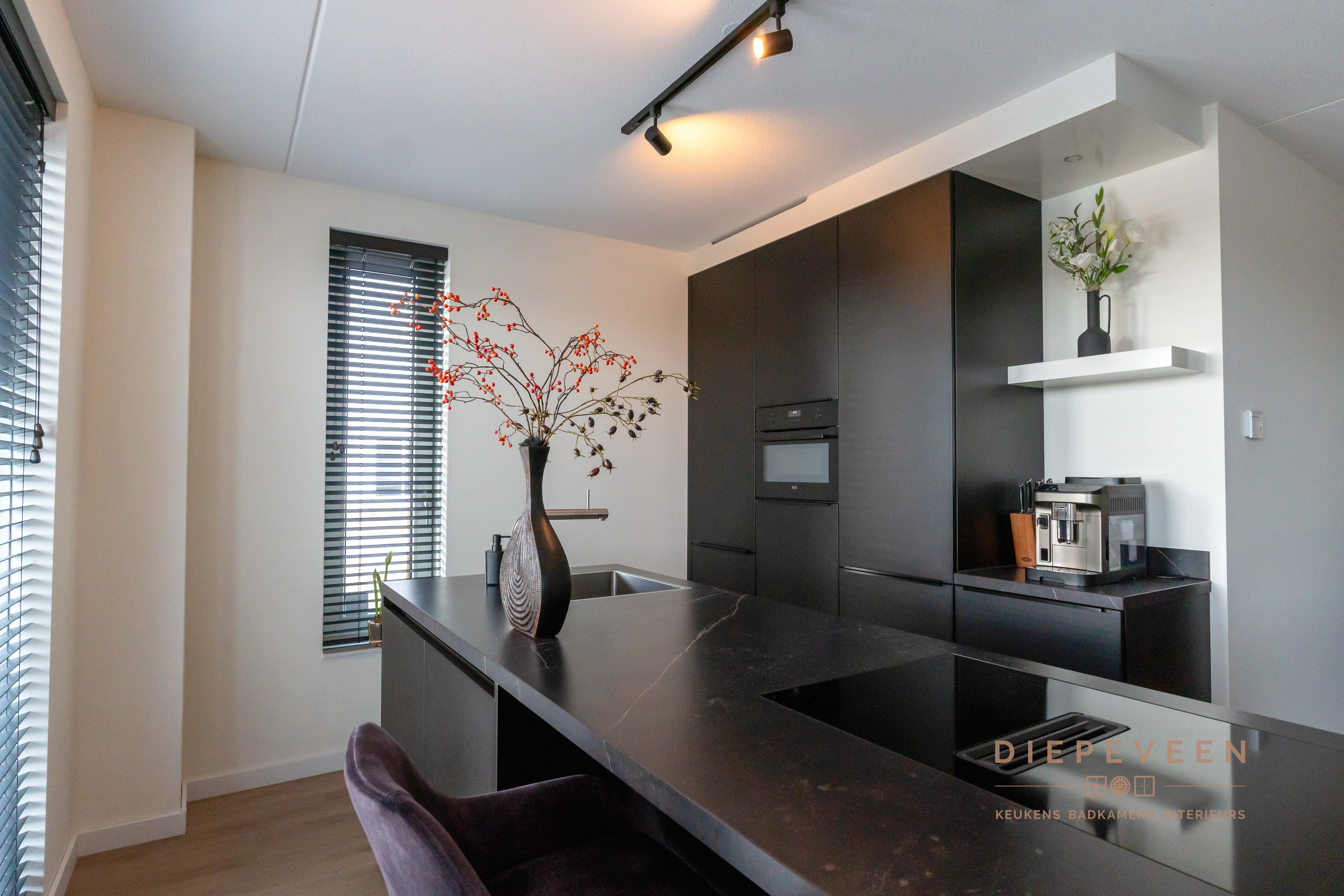 In deze keuken voegde we twee stijlen samen. En wat een prachtig effect! De moderne indeling en het strakke werkblad zorgen voor een mooi contrast met de zwarte houtlook fronten. Ook geniet je van het gemak van de Quooker. De fronten aan het eiland zijn greeploos, de fronten van het keukenblok zijn uitgevoerd met een stijlvolle langwerpige greep. Alles is perfect gestyled! Wie wordt daar nou niet blij van?!