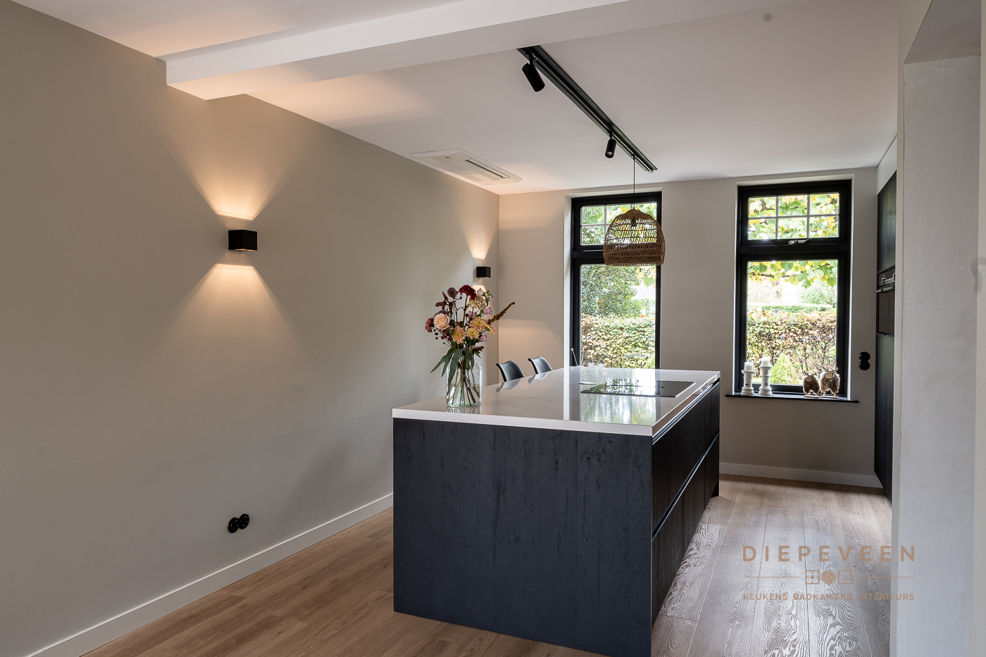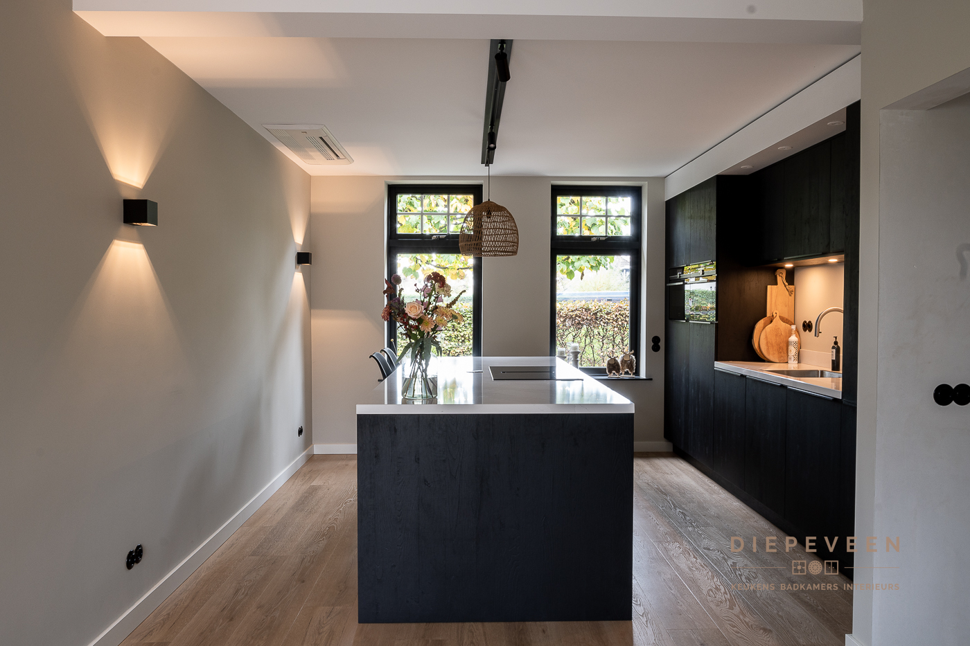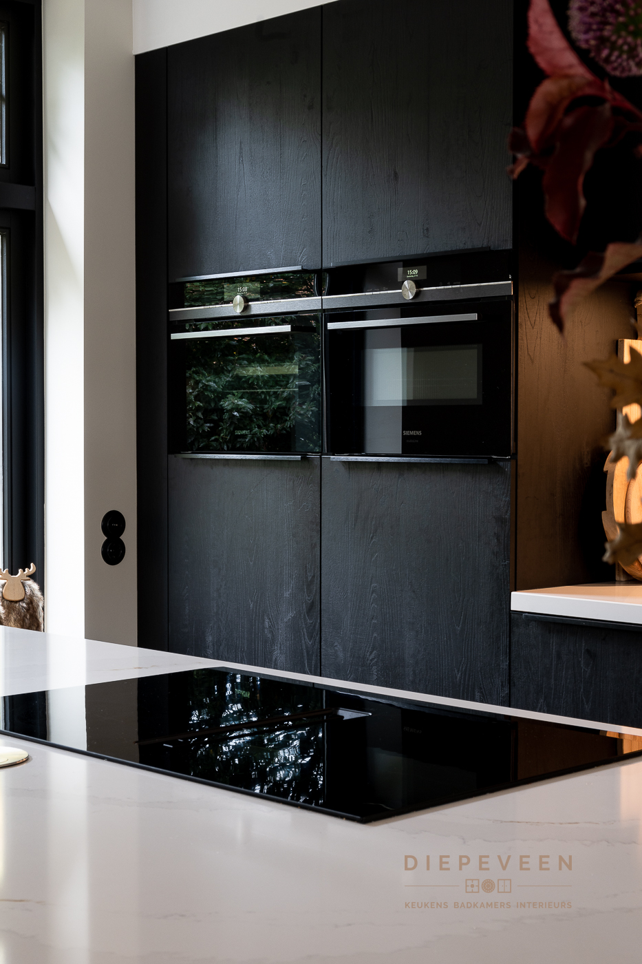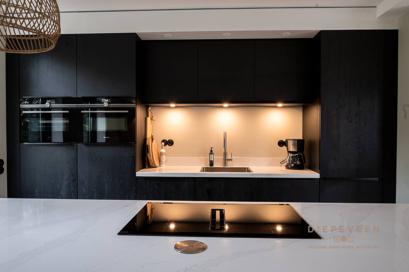 In deze keuken voegde we twee stijlen samen. En wat een prachtig effect! De moderne indeling en het strakke werkblad zorgen voor een mooi contrast met de zwarte houtlook fronten. Ook geniet je van het gemak van de Quooker. De fronten aan het eiland zijn greeploos, de fronten van het keukenblok zijn uitgevoerd met een stijlvolle langwerpige greep. Alles is perfect gestyled! Wie wordt daar nou niet blij van?!