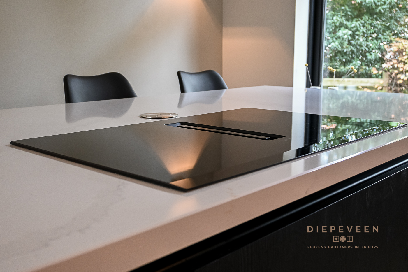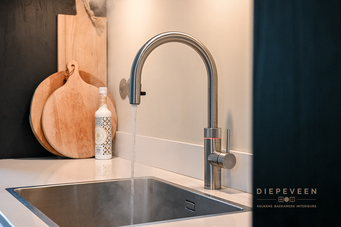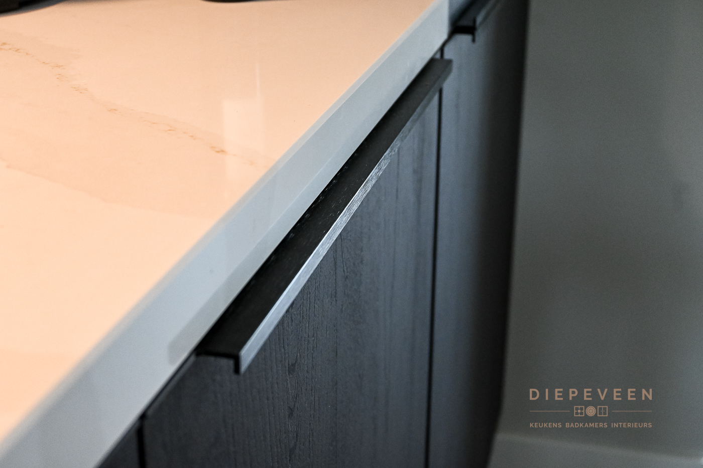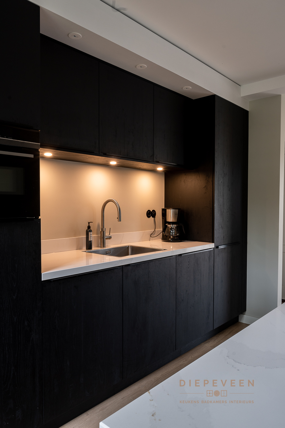 In deze keuken voegde we twee stijlen samen. En wat een prachtig effect! De moderne indeling en het strakke werkblad zorgen voor een mooi contrast met de zwarte houtlook fronten. Ook geniet je van het gemak van de Quooker. De fronten aan het eiland zijn greeploos, de fronten van het keukenblok zijn uitgevoerd met een stijlvolle langwerpige greep. Alles is perfect gestyled! Wie wordt daar nou niet blij van?!