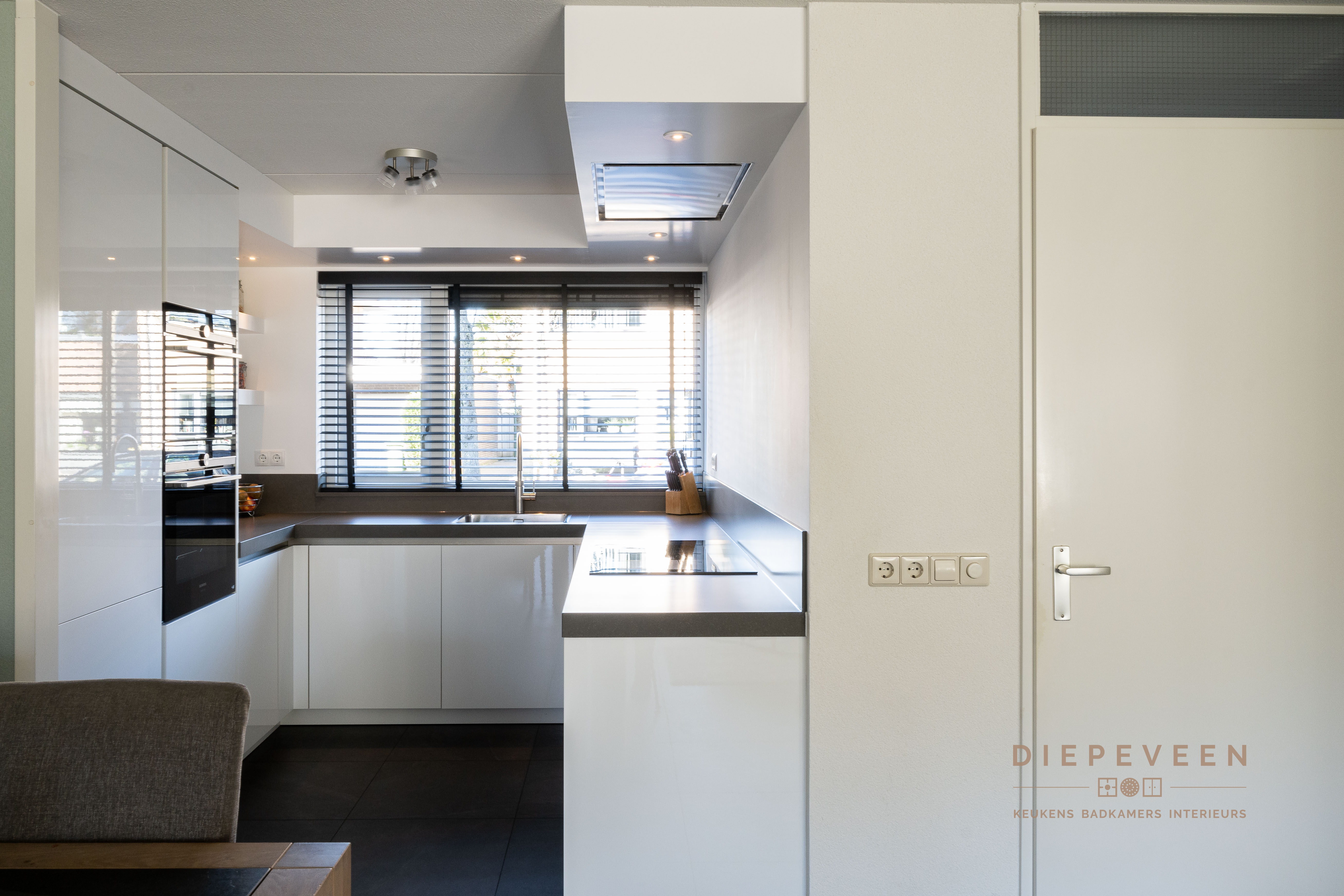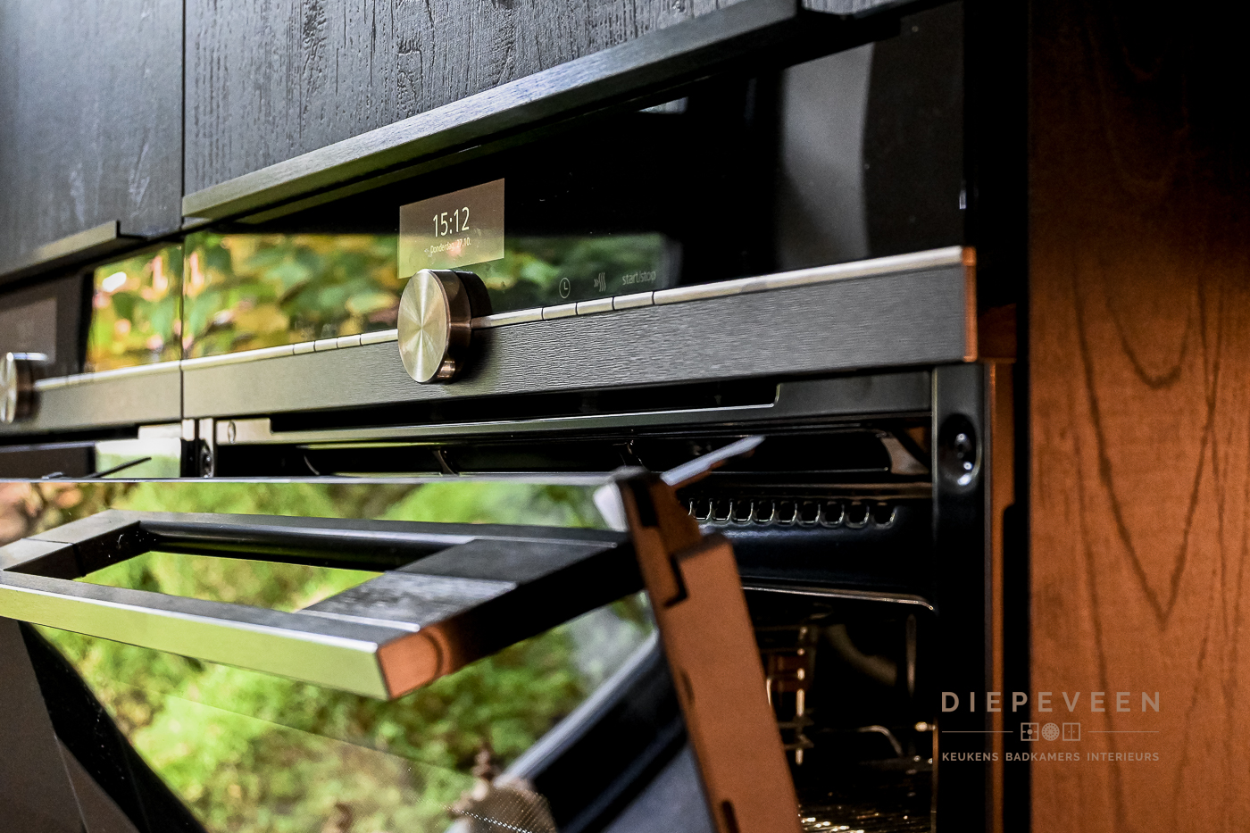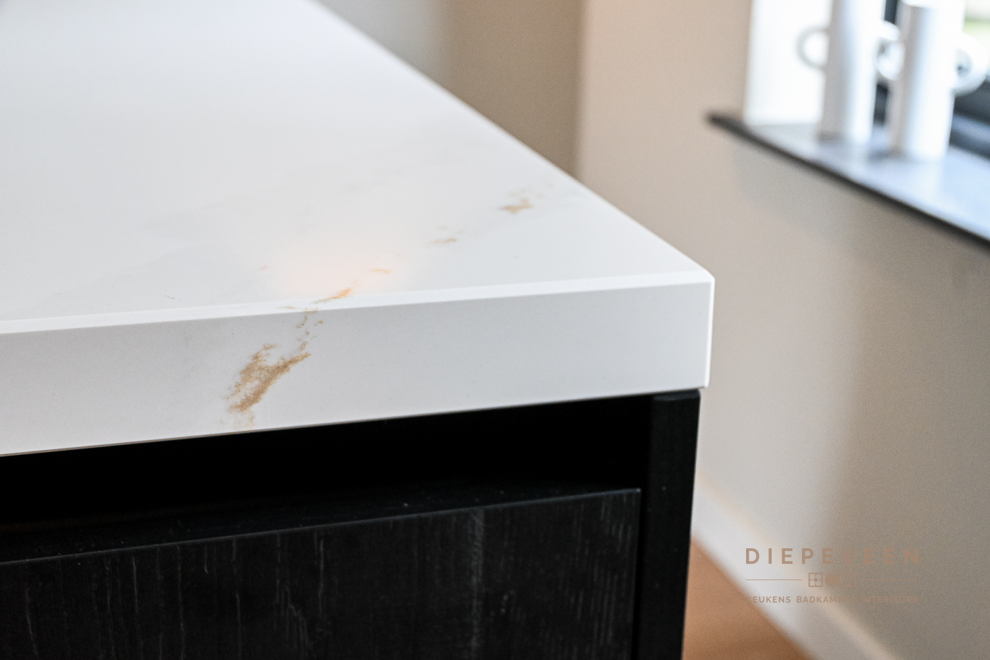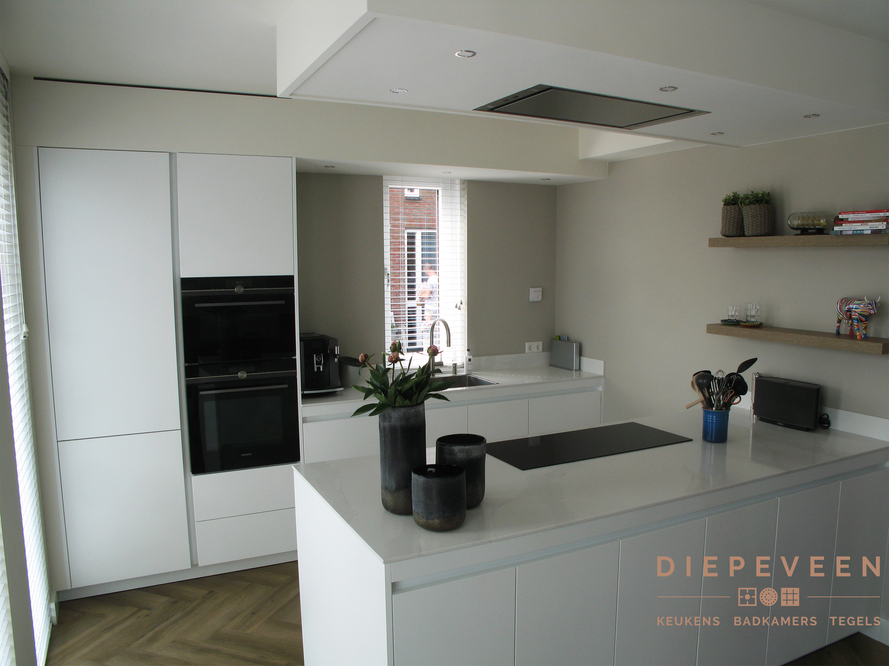 In deze keuken voegde we twee stijlen samen. En wat een prachtig effect! De moderne indeling en het strakke werkblad zorgen voor een mooi contrast met de zwarte houtlook fronten. Ook geniet je van het gemak van de Quooker. De fronten aan het eiland zijn greeploos, de fronten van het keukenblok zijn uitgevoerd met een stijlvolle langwerpige greep. Alles is perfect gestyled! Wie wordt daar nou niet blij van?!