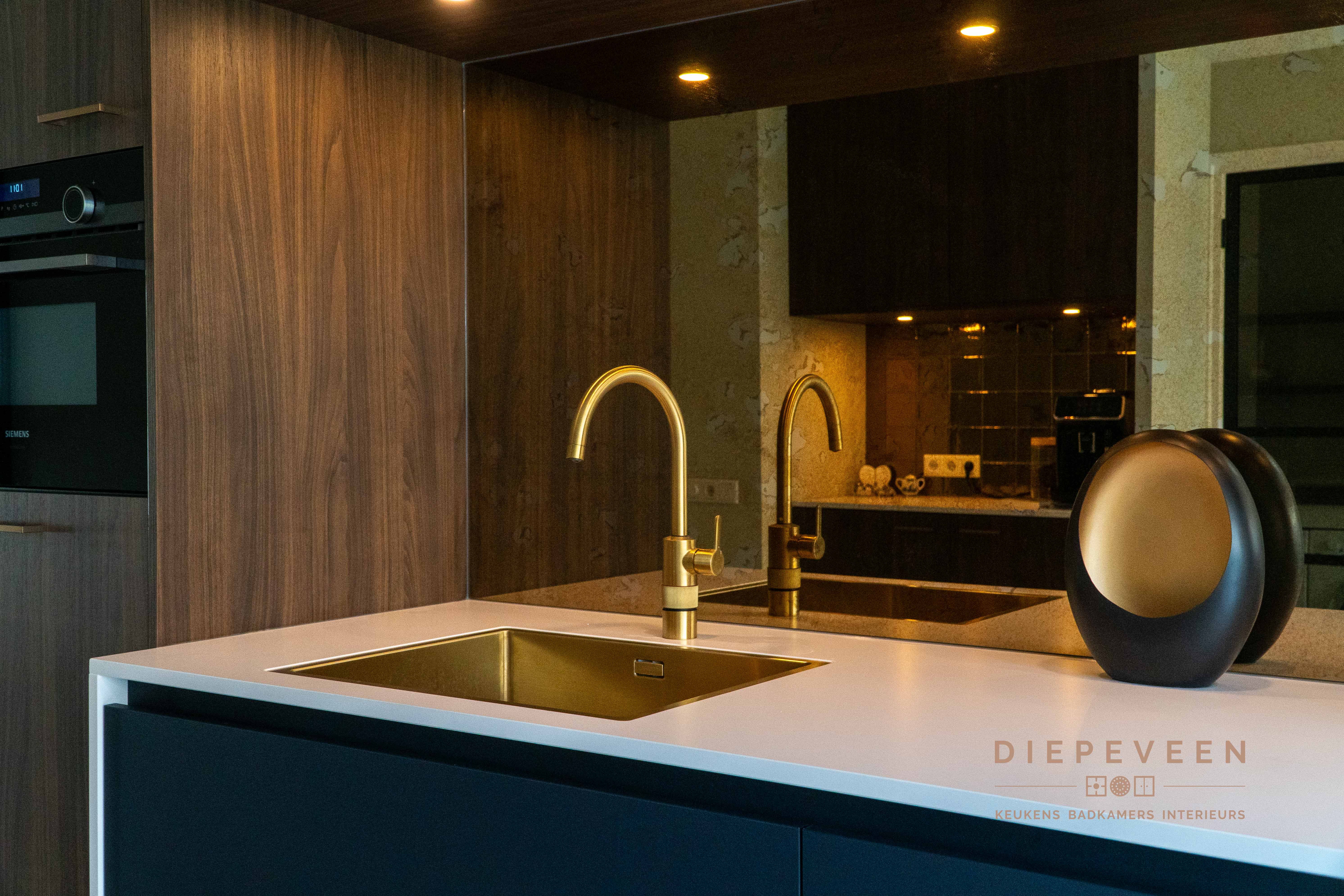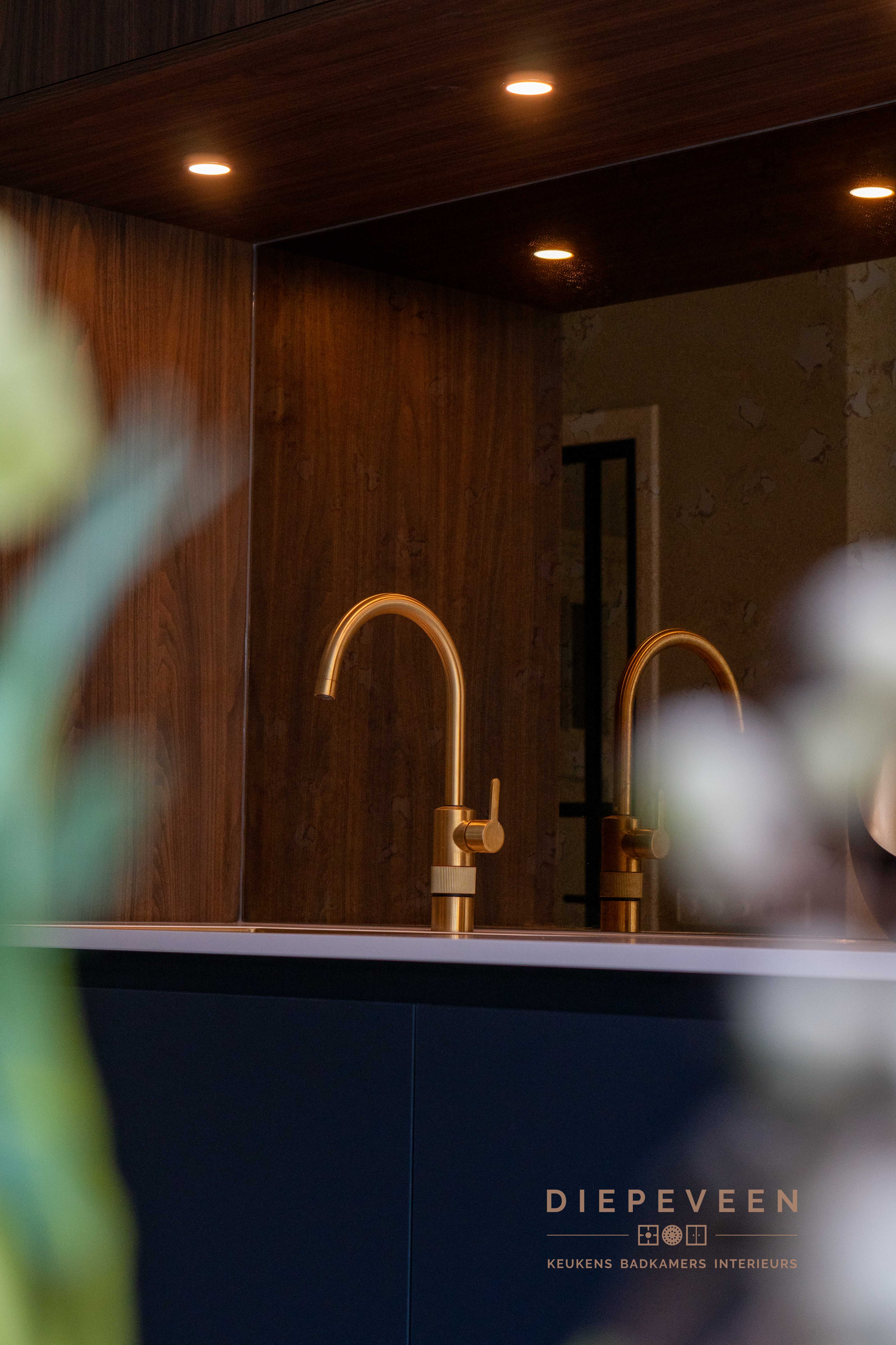 De gouden kranen en subtiele verlichting maken het geheel compleet en geven een luxe gevoel. De keuken biedt veel opbergruimte en is praktisch ingedeeld, waardoor het een fijne plek is om te koken en tijd door te brengen. Een tijdloze keuken die sfeer en functionaliteit perfect in balans brengt.
