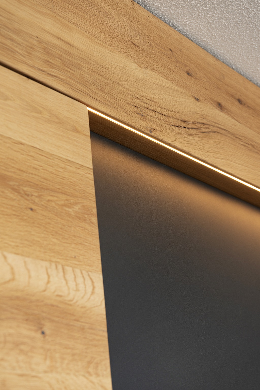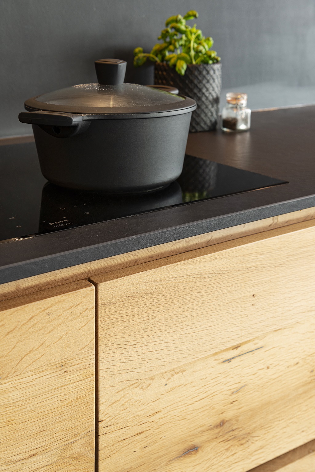 Een mooie strakke landelijke keuken van geschaafd oud eiken en een Grezzo betonnen werkblad.