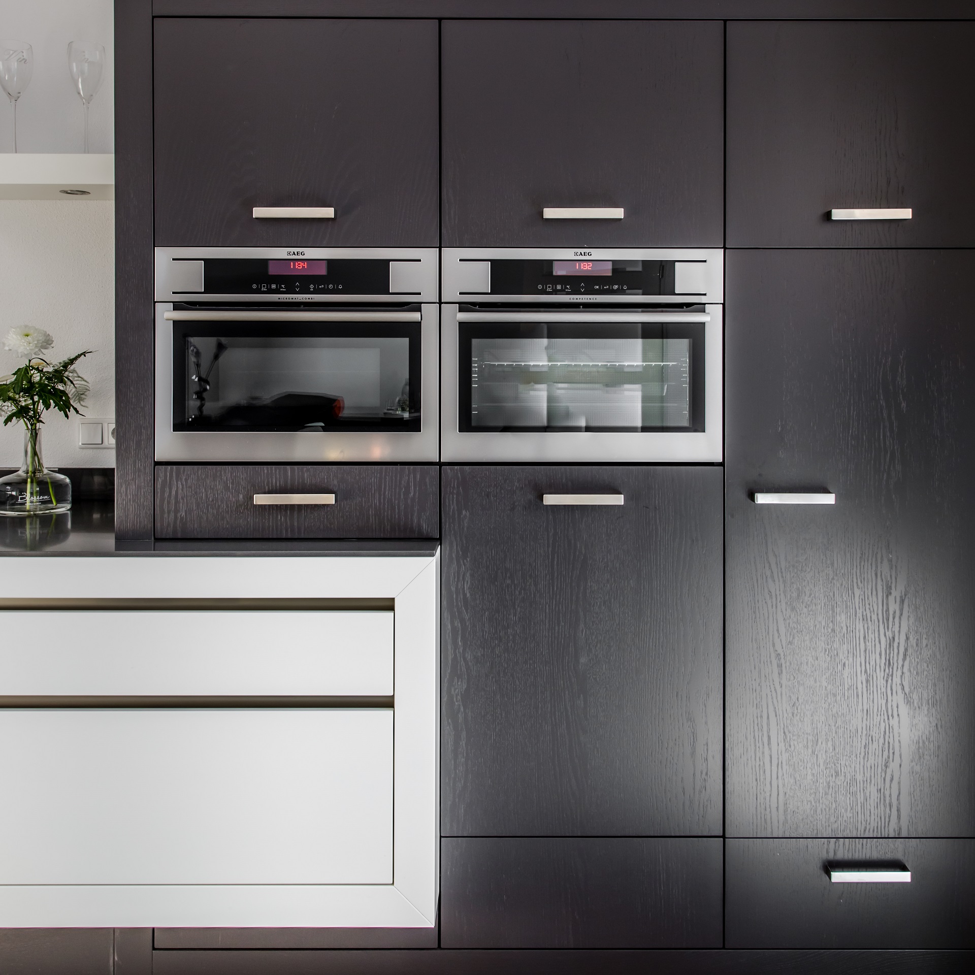 Deze keuken is uniek door zijn ontwerp. De keuken bestaat uit 3 blokken. Het greeploze spoeldeel en het kookgedeelte zijn omkaderd door stoere stollenwanden. De stollenwanden zijn in verstek gezet en vormen zo één blok met de ladekasten. Het kookgedeelte is als één blok geïntegreerd in de basalt kastenwand. Door de blok naar voren te halen en de plint van de kastenwand door te trekken krijgt het geheel een leuk zwevend effect.