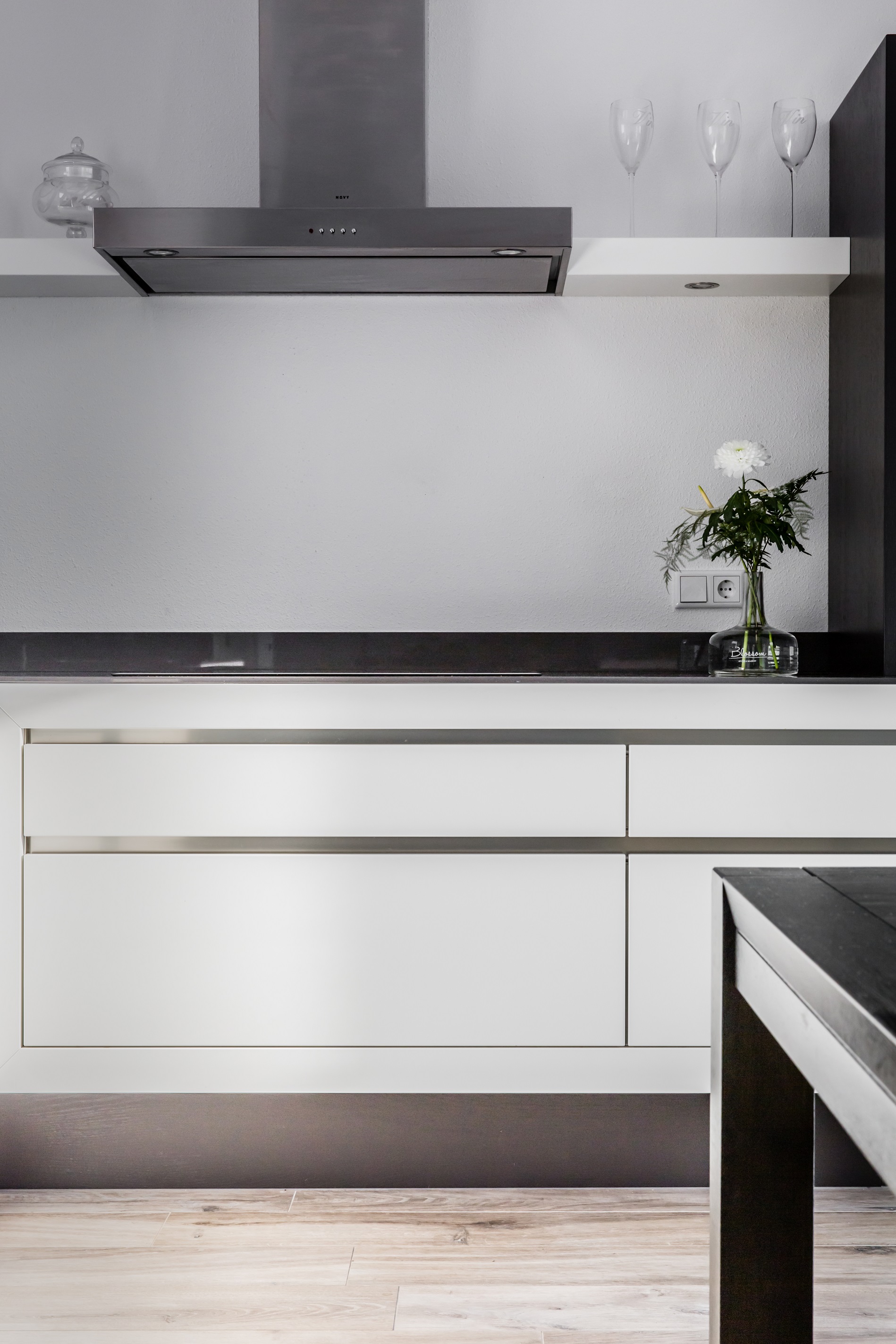 Greeploze zwevende witte keuken met basalt houten kastenwand