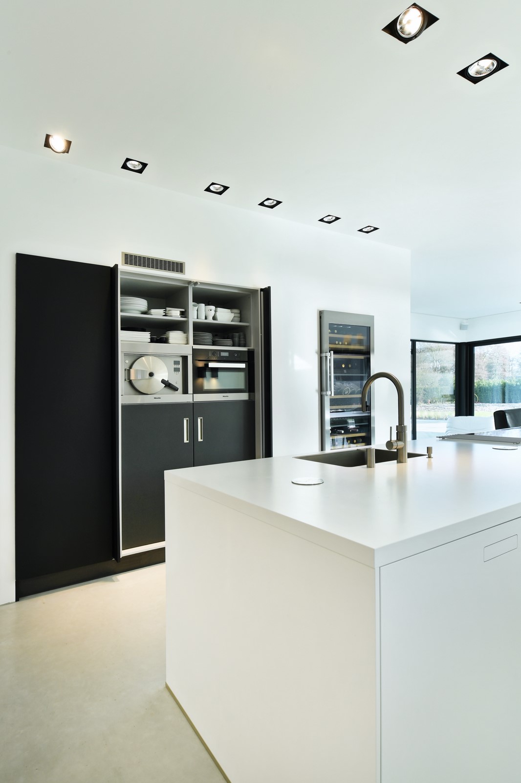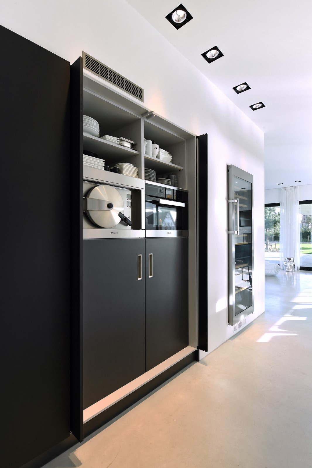 Voor de apparatuur in de keuken is gekozen voor een Miele CleanSteel hogedrukstoomoven. Deze stoomoven is voorzien van Powersteam waarmee onder hoge druk met een temperatuur van 120 graden Celcius uw gerecht in een kortere bereidingstijd wordt bereid. Ook beschikt de keuken over een Miele Pureline oven met magnetronfunctie. De vaatwasser is ook van Miele. De vriezer en koelkast zijn uit de iQ500 serie van Siemens. De Liebherr wijnklimaatkast zorgt ervoor dat wijn op de perfecte temperatuur geserveerd kan worden.