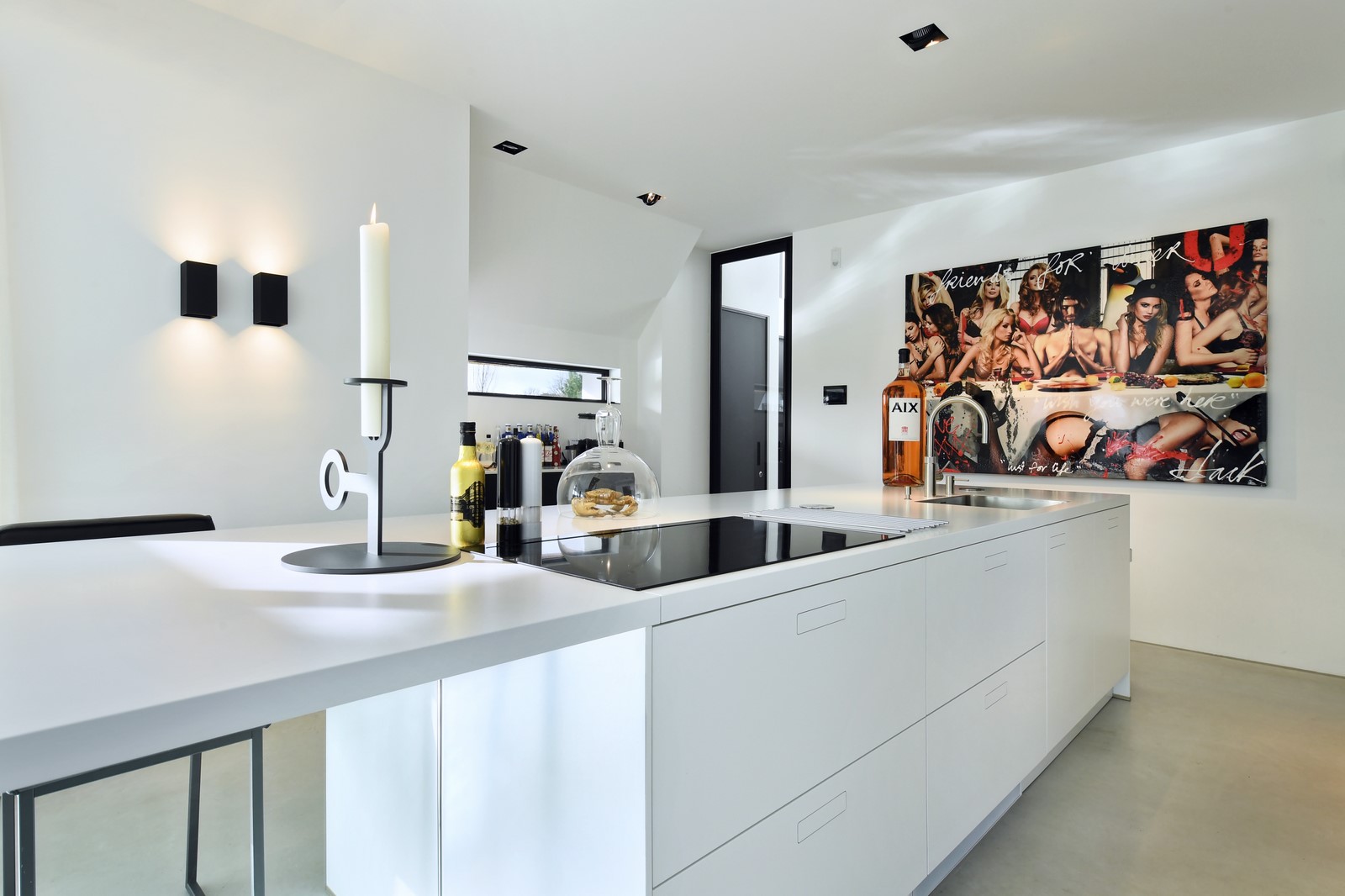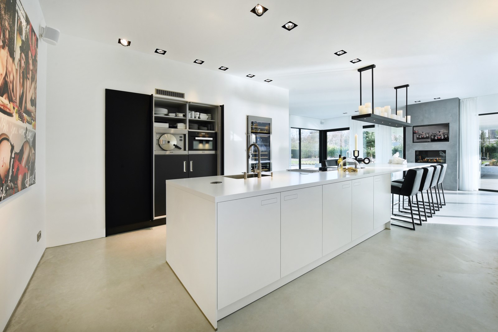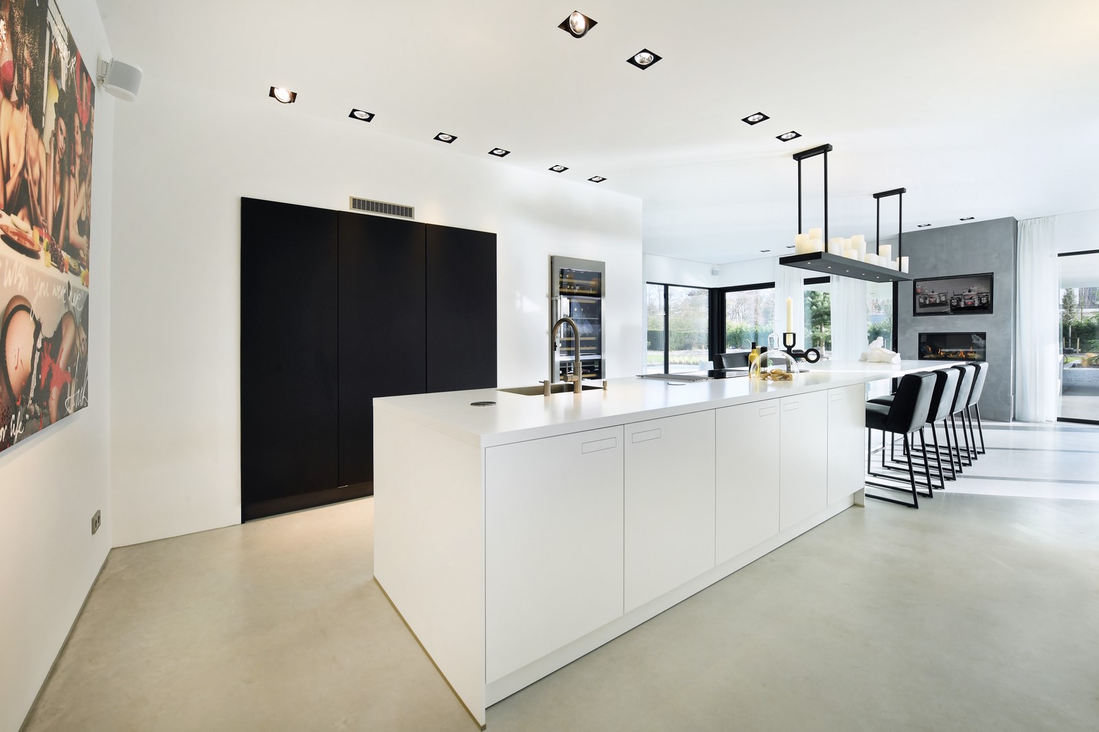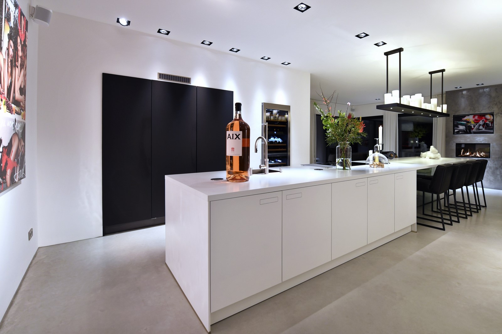 In deze moderne villa hebben we een prachtige Next125 keuken mogen ontwerpen en plaatsen. Deze keuken bestaat uit twee verschillende modellen uit de Next125 collectie. Het eiland is de NX800 in de kleur Solid kristalwit en de kastenwand is de NX240 in de kleur Fenix onyxzwart softmat.