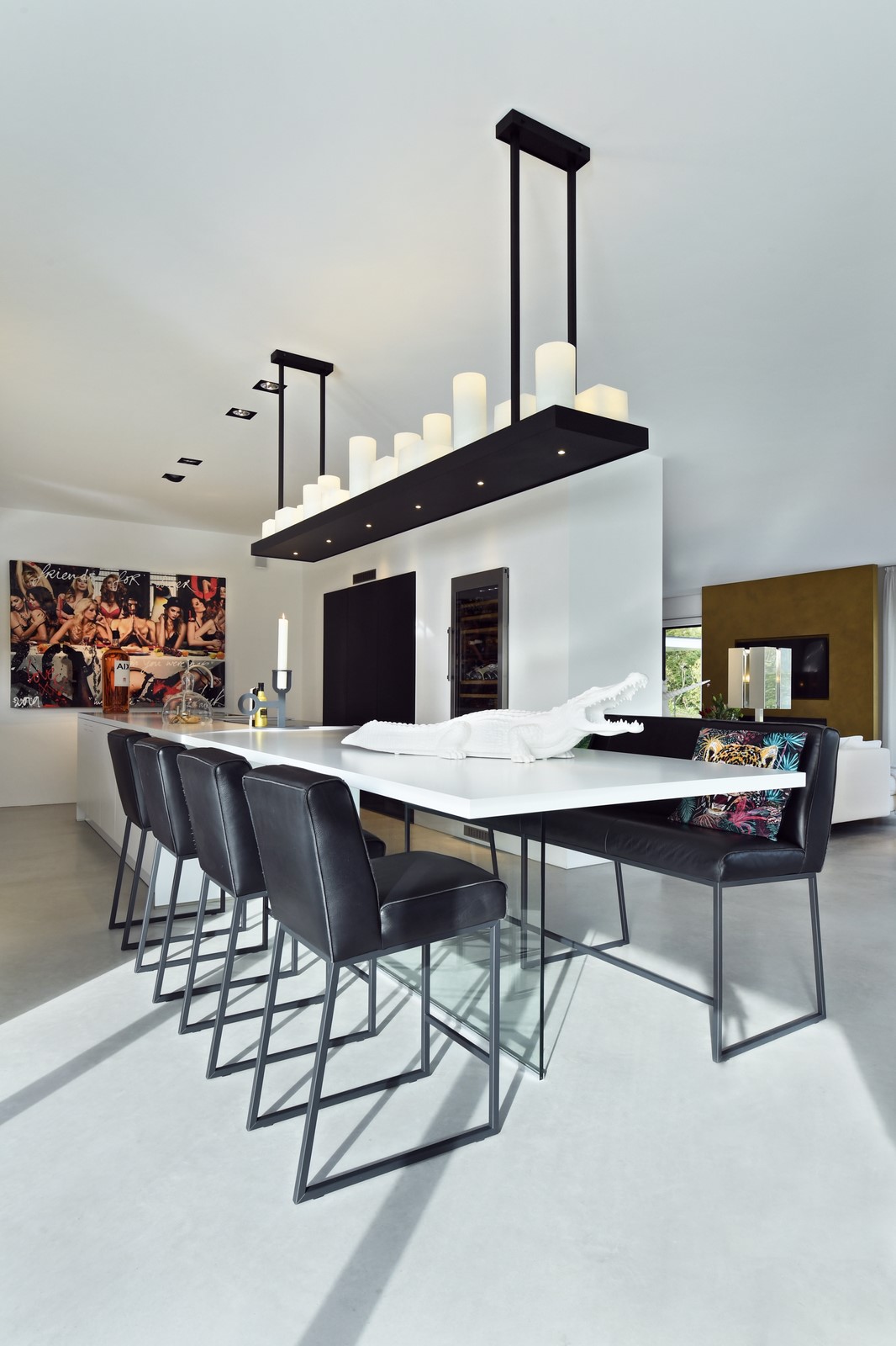 Het werkblad van het eiland is een composiet werkblad, de Silestone Eternal Statuario. Statuario is geïnspireerd op het klassieke Italiaanse Carrarisch marmer. Statuario heeft een wit oppervlak met zachtgrijze vloeiende aders. In deze ruimte is ervoor gekozen om het werkblad te verlengen, zodat het verlengde bladgedeelte fungeert als tafel.