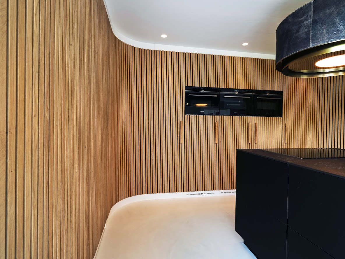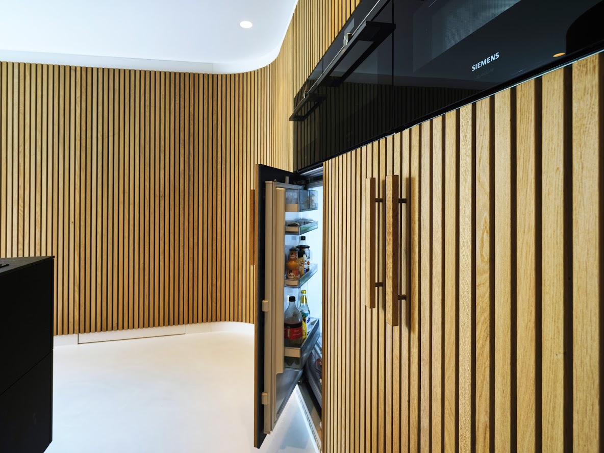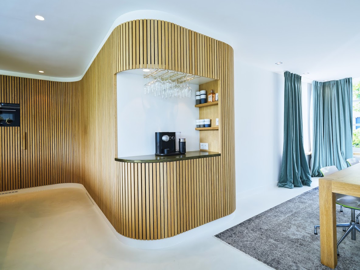 Deze prachtige keuken is van het merk Mereno. Een handgemaakte keuken waarbij ieder product maatwerk is. Een exclusieve keuken waar alles tot in het kleinste detail persoonlijk is. Een prachtige kastenwand van hout die ontworpen is voor de keuken familie Kooi. Een houten wand die op het het eerste gezicht een gewone houten wand lijkt, maar waar verschillende opbergmogelijkheden gemaakt zijn. Ook is er links in de wand een deur die toegang geeft naar een andere ruimte. Rechts is er in de wand een grote nis gemaakt waar een koffieruimte gecreëerd is en tevens de wijnglazen aan een mooi ophangrek hangen.