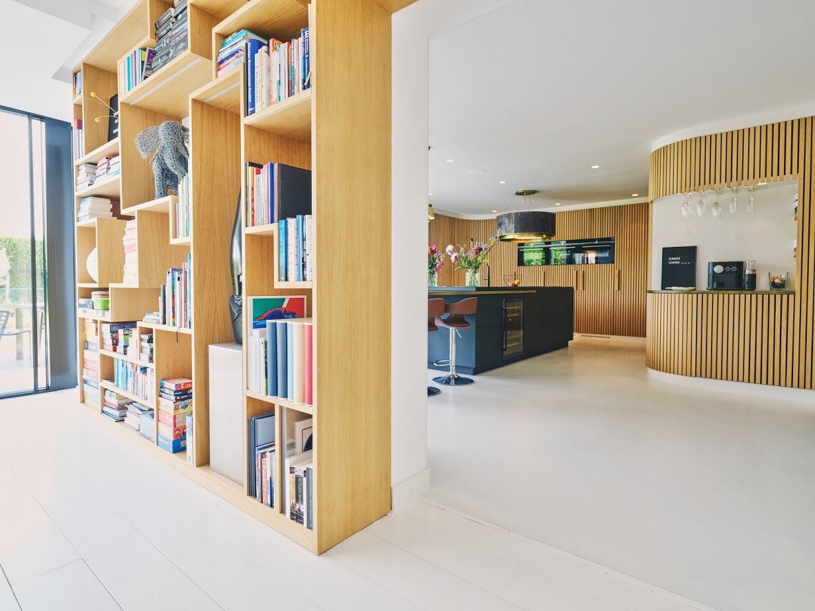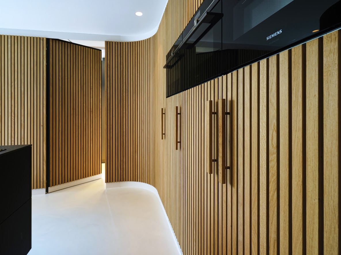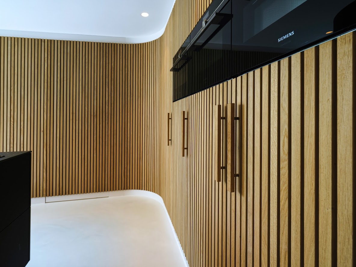 Deze prachtige keuken is van het merk Mereno. Een handgemaakte keuken waarbij ieder product maatwerk is. Een exclusieve keuken waar alles tot in het kleinste detail persoonlijk is. Een prachtige kastenwand van hout die ontworpen is voor de keuken familie Kooi. Een houten wand die op het het eerste gezicht een gewone houten wand lijkt, maar waar verschillende opbergmogelijkheden gemaakt zijn. Ook is er links in de wand een deur die toegang geeft naar een andere ruimte. Rechts is er in de wand een grote nis gemaakt waar een koffieruimte gecreëerd is en tevens de wijnglazen aan een mooi ophangrek hangen.