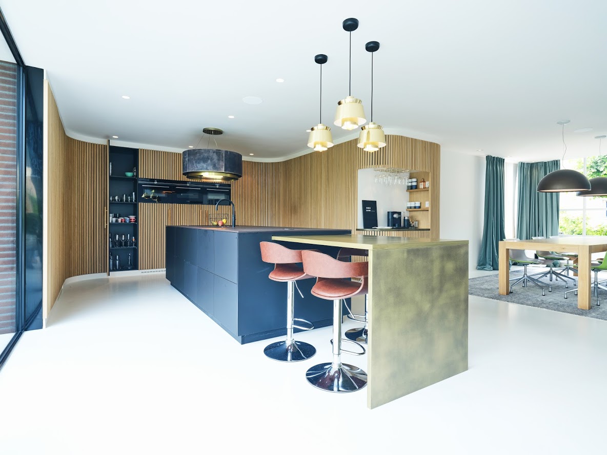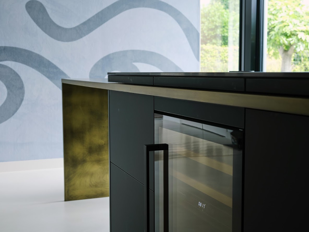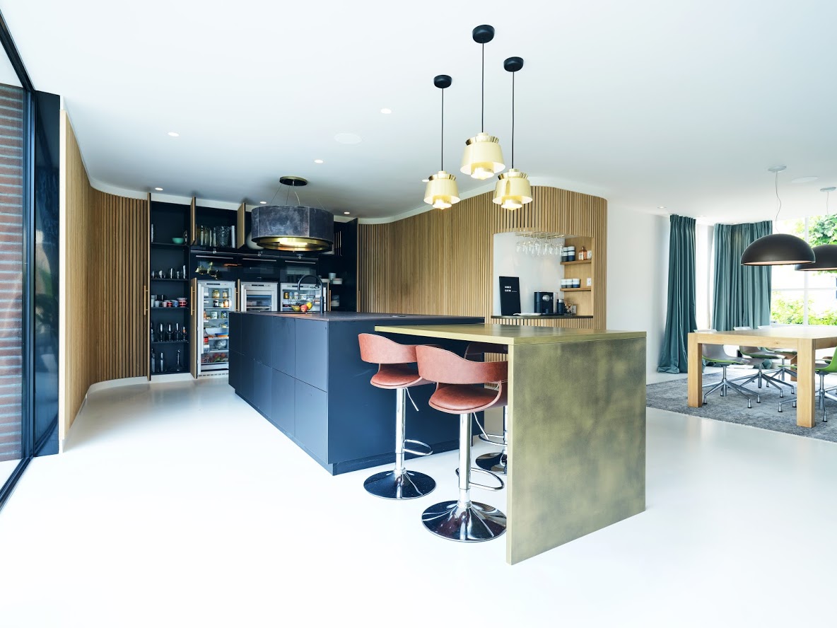 Het aanrechtblad is een Dekton aanrechtblad in de kleur Kelya Satin. Een keukenblad van Dekton heeft een strakke uitstraling en heeft verschillende positieve eigenschappen. Zo is het hittebestendig, uiterst krasbestendig, niet poreus en watervast, vlekbestendig en onderhoudsarm. Het bargedeelte van de keuken is gemaakt van messing. Messing heeft een aantrekkelijke kleur, die op goud lijkt. Messing wordt ook wel geelkoper genoemd.