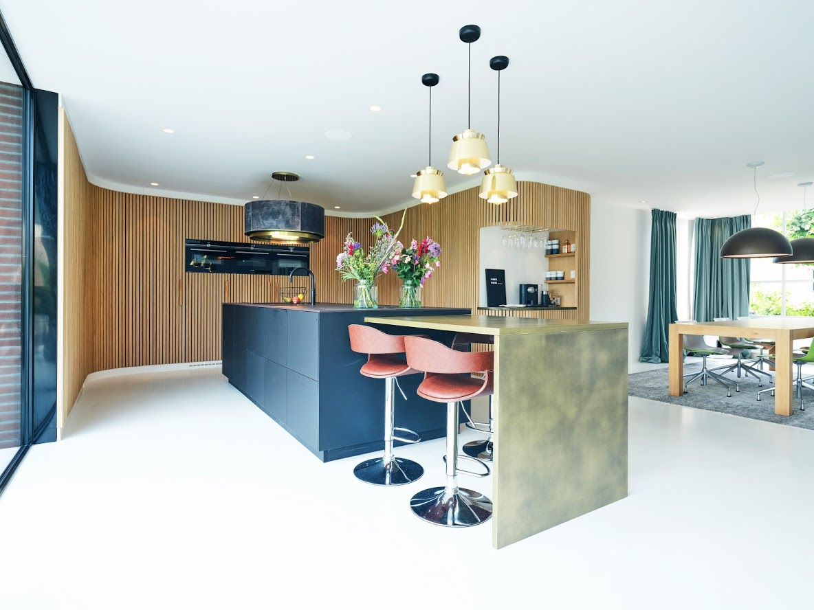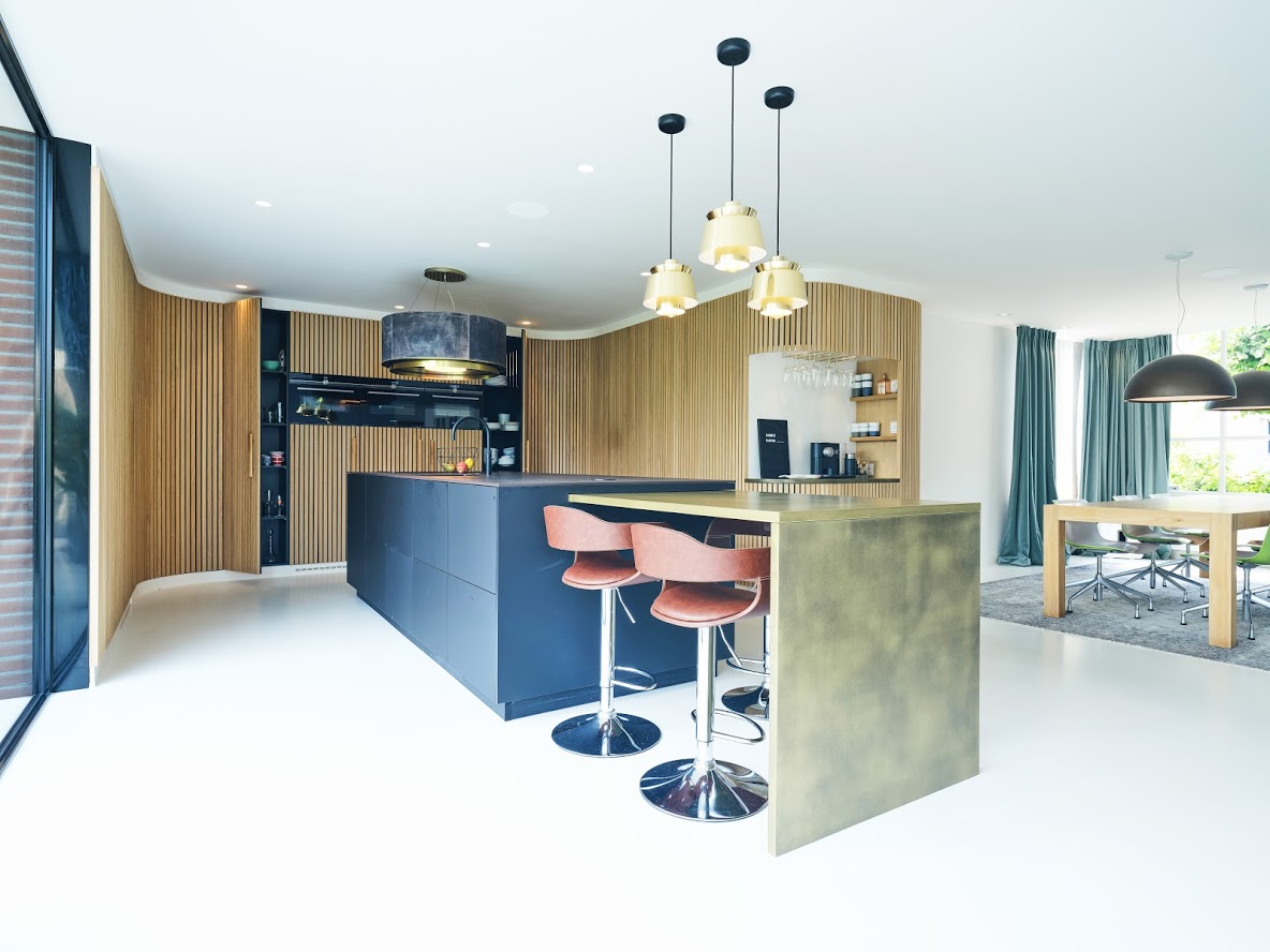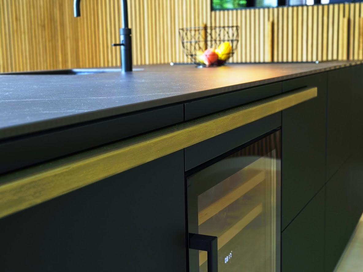 Het aanrechtblad is een Dekton aanrechtblad in de kleur Kelya Satin. Een keukenblad van Dekton heeft een strakke uitstraling en heeft verschillende positieve eigenschappen. Zo is het hittebestendig, uiterst krasbestendig, niet poreus en watervast, vlekbestendig en onderhoudsarm. Het bargedeelte van de keuken is gemaakt van messing. Messing heeft een aantrekkelijke kleur, die op goud lijkt. Messing wordt ook wel geelkoper genoemd.