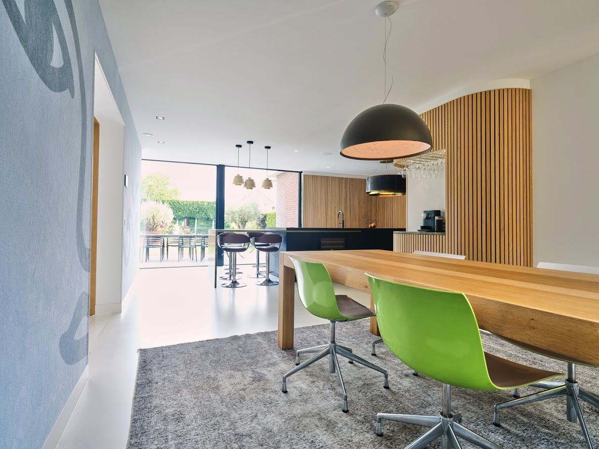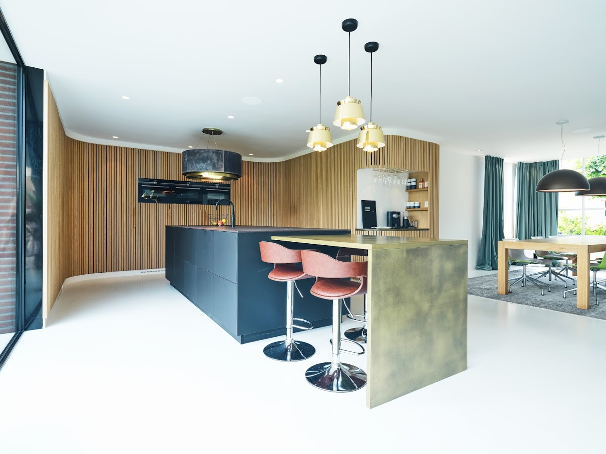 Voor een mooi en strak geheel, is er gekozen voor een zwarte Quooker, zwarte apparatuur van Siemens in de houten kastenwand, een wijnklimaatkast en een Wave design eiland afzuigkap. Deze eiland afzuigkap hangt aan stalen draden en spindels waardoor ze nauwelijks verbinding maken met het plafond.