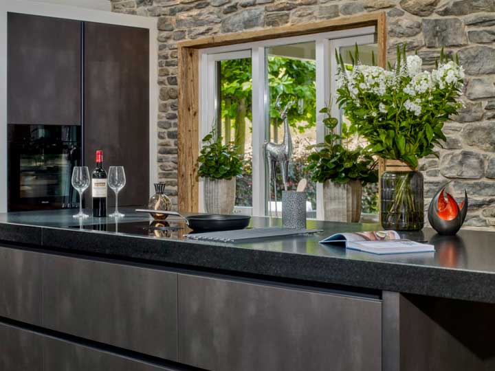 Deze chique greeploze keuken is van het merk Schüller. Een keuken die mede door het hout en de stenen wand een Oostenrijkse sfeer heeft. De fronten van de keuken zijn uitgevoerd in de kleur donker staal imitatie, een prachtige combinatie met het hout.