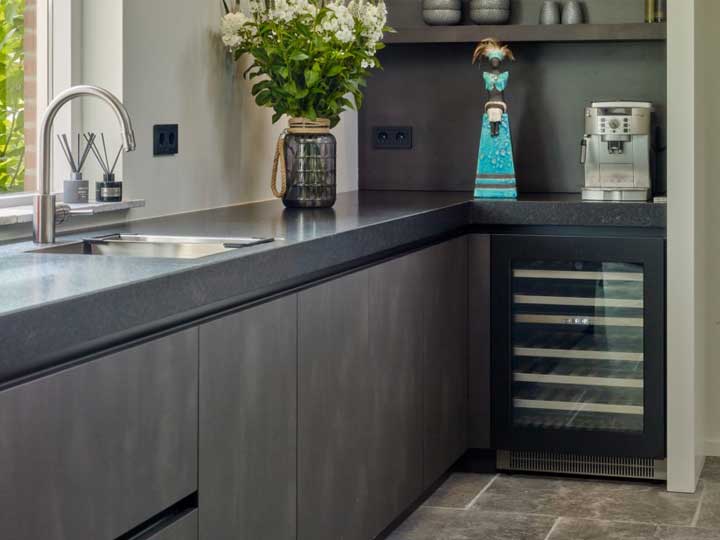 Voor het aanrechtblad is gekozen voor een granieten blad van Arte in de kleur Black Indy Leather. Een granieten aanrechtblad is een 100% natuurproduct, waardoor ook ieder product uniek is. Een aanrechtblad van graniet is stootvast en slijtvast. Doordat het een natuurmateriaal is dat uit één stuk gewonnen wordt, zal het blad niet snel tekenen van slijtage vertonen. Behandel een granieten blad voor lang en mooi behoud één of twee keer per jaar met een cleaner en impregneermiddel.