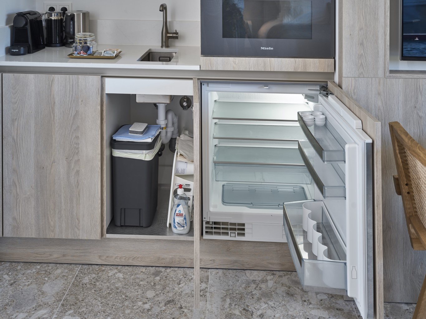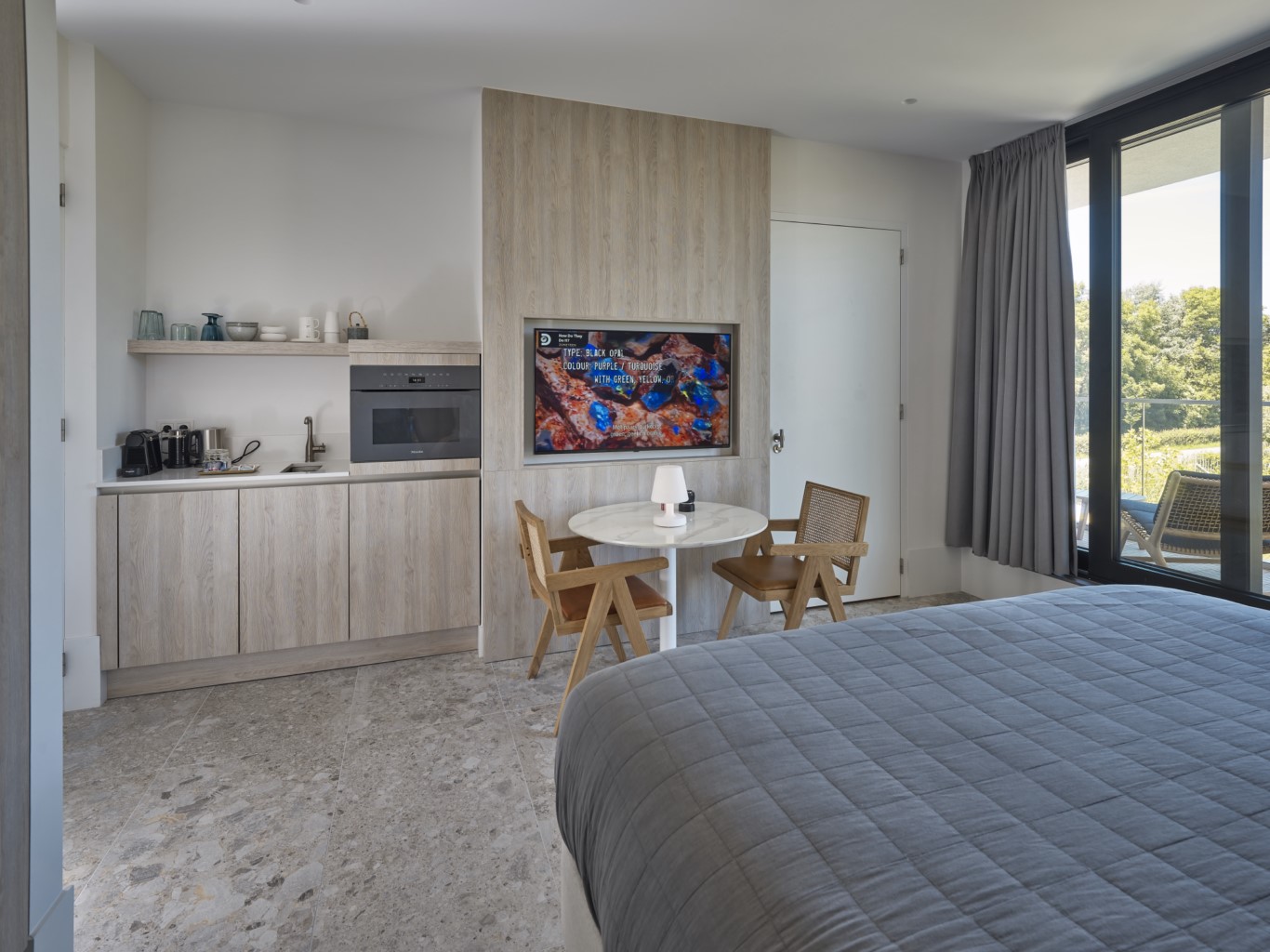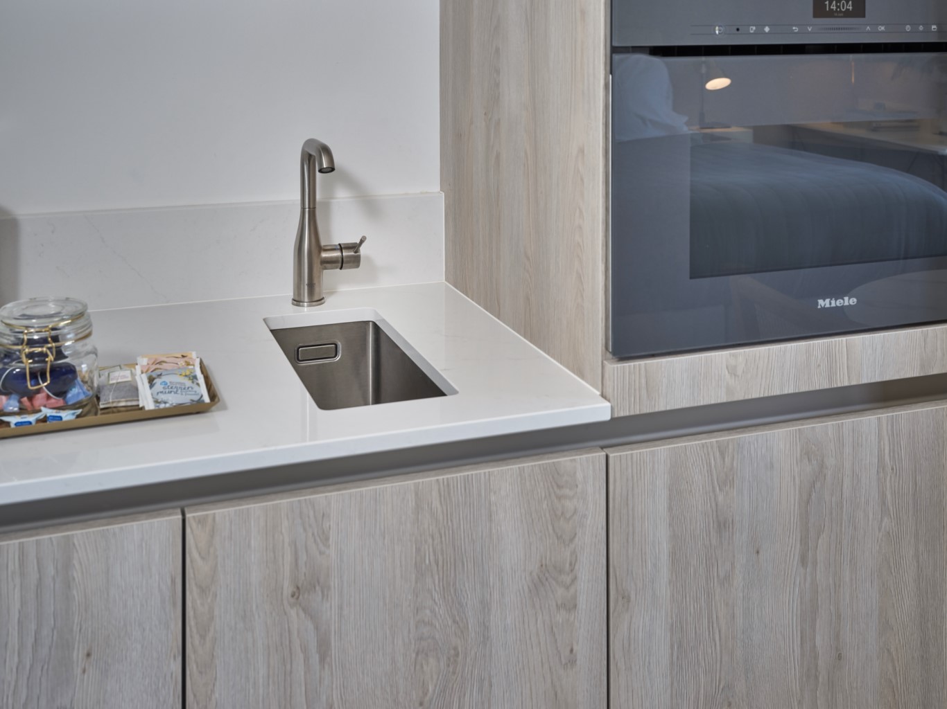 De stijl van de keuken in het woongedeelte en het bijgebouw zijn eveneens doorgetrokken naar de Summum Suites. Zo hebben ook de keukens in de Summum Suites een Arte marmerlook aanrechblad in de kleur Eternal Statuario.