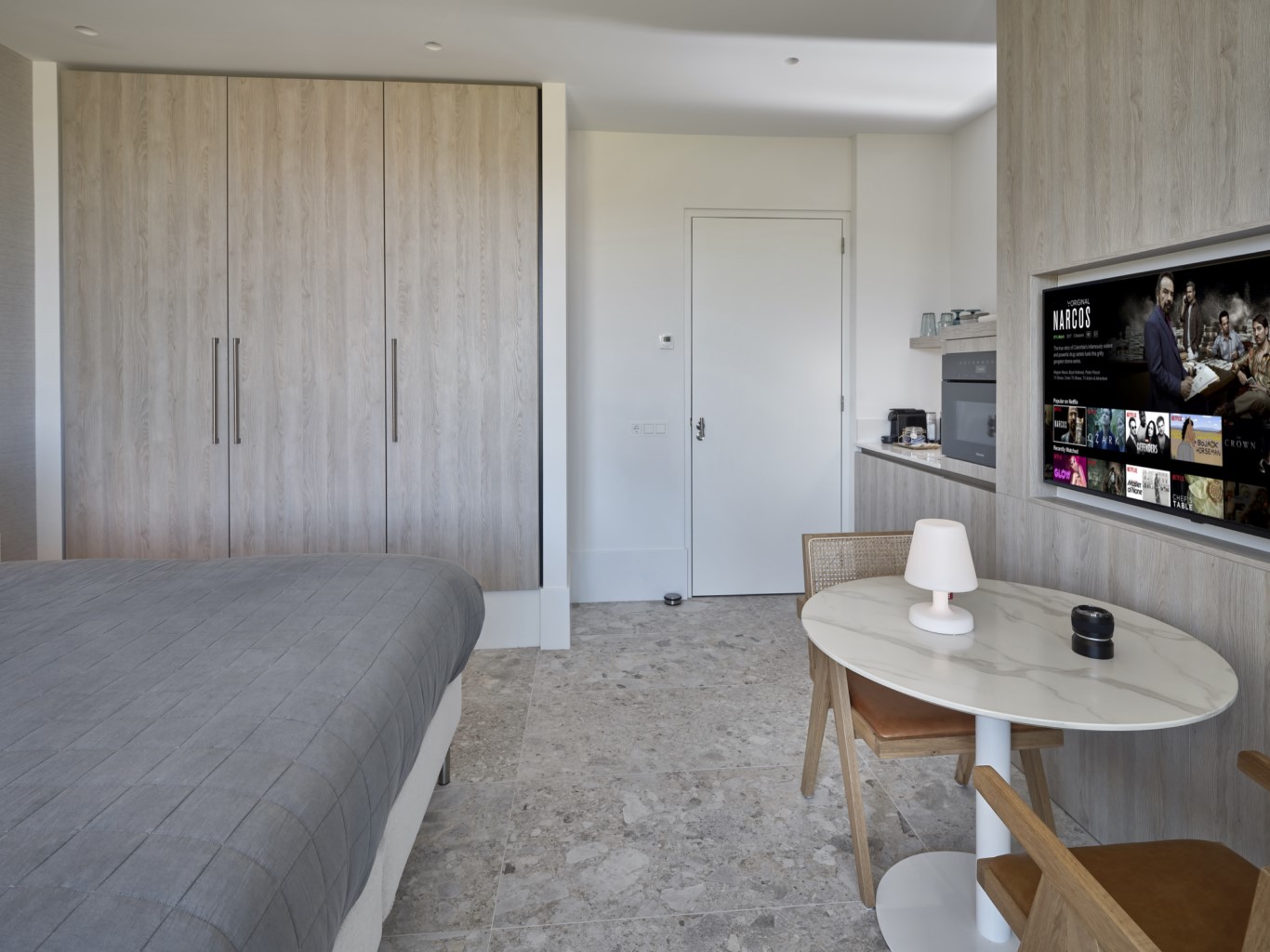 De suites zijn de perfecte locatie voor een kort of langer verblijf. Licht, ruimte en natuurlijke materialen geven Summum Suites een uiterst prettige atmosfeer. Ook in deze suites stonden luxe materialen en optimaal comfort duidelijk bovenaan het prioriteitenlijstje. Je ziet het aan alles. De prachtige wandbekleding en houten inbouwkasten. Het luxe sanitair en de mooie compacte pantry’s. “Het was even puzzelen om alles erin te krijgen”, vertelt Nico Paasse van Tieleman Keukens over die laatste, “maar dat was juist een leuke uitdaging.”
