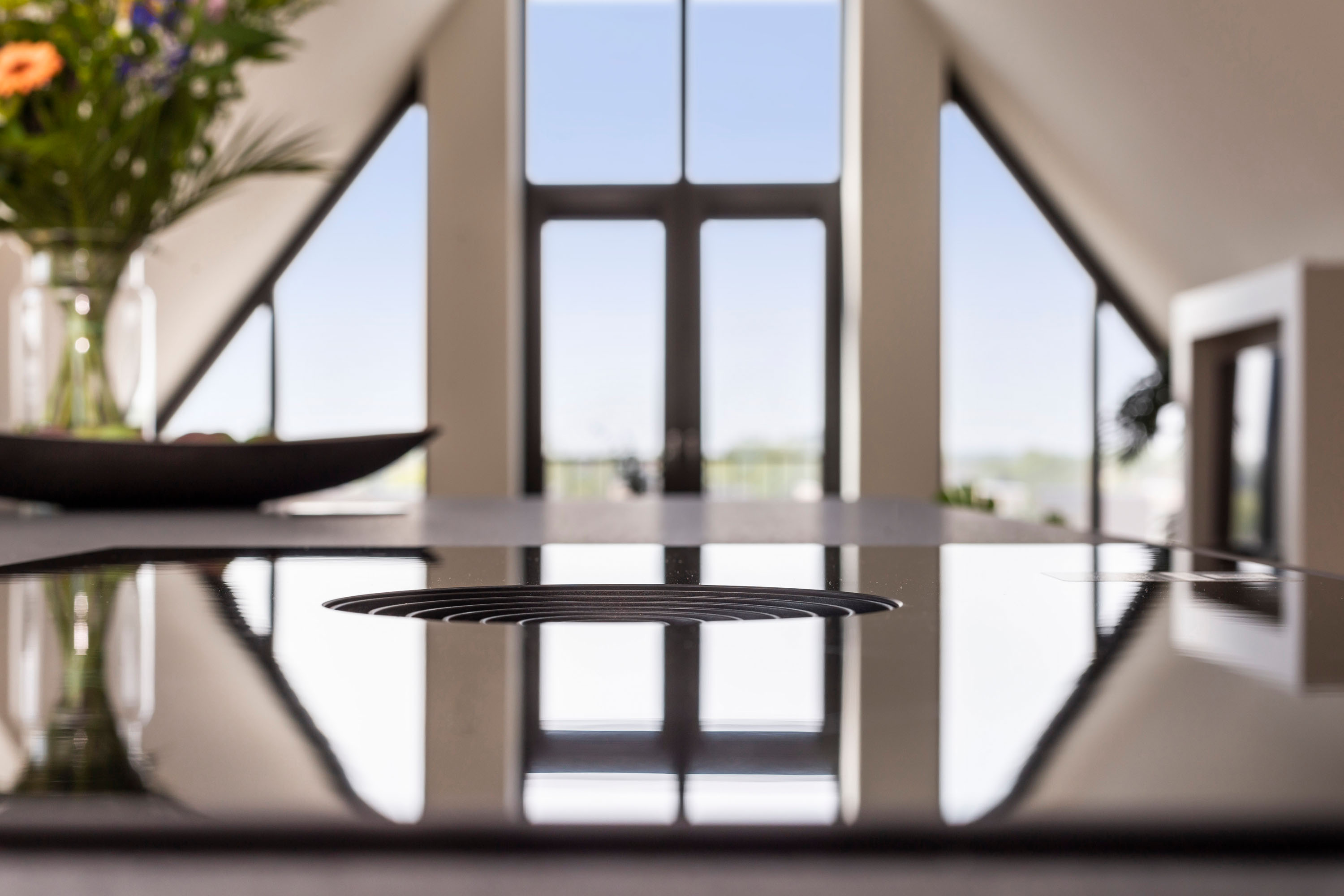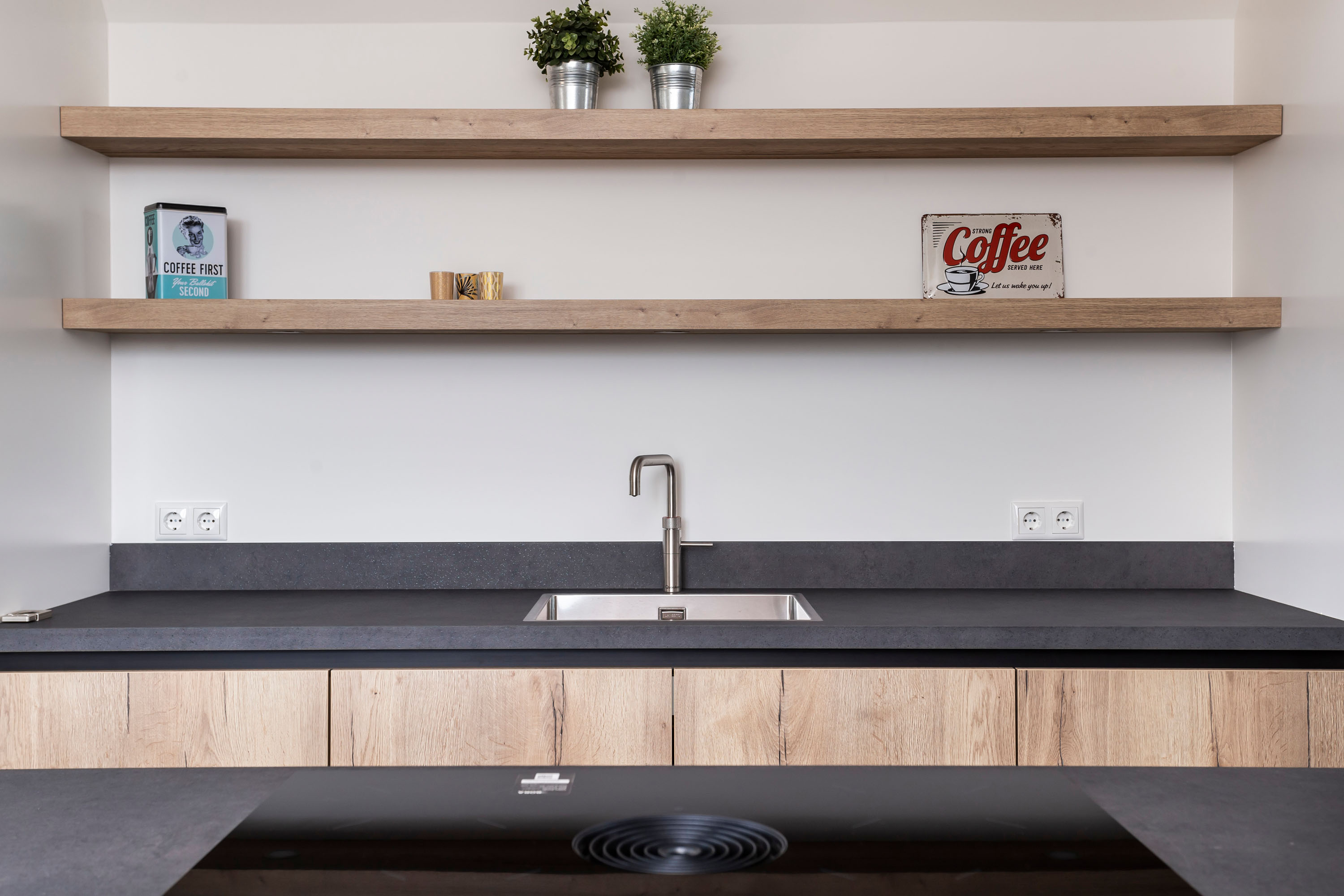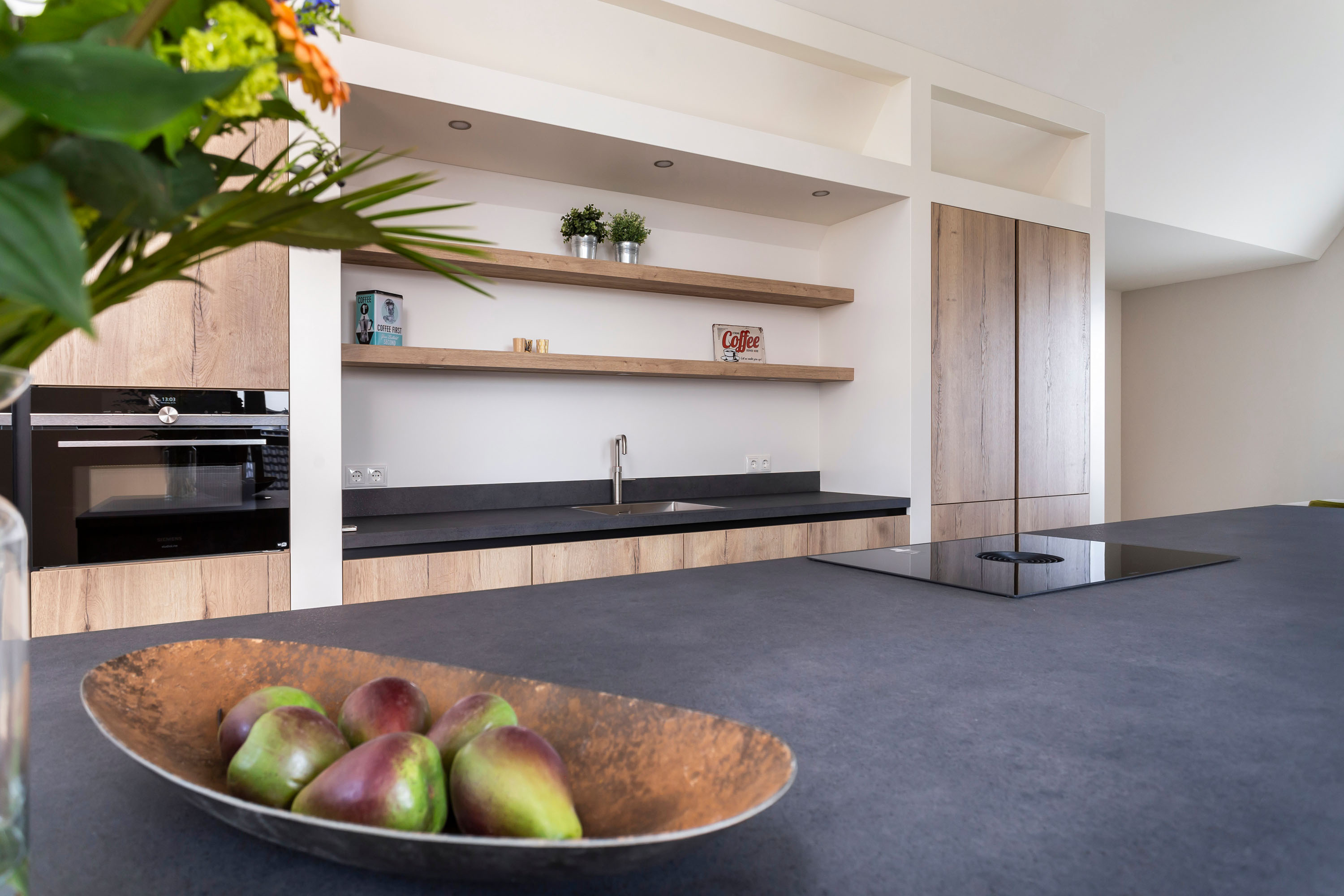 Om het zicht niet te belemmeren, is er gekozen voor een inductiekookplaat met afzuigsysteem. De Bora Pure staat voor puristisch, strak en minimalistisch! Een mooi design wat de keuken meer uitstraling geeft, omdat er geen grote afzuigkap meer nodig is. Het werkblad van de keuken is een 10 mm Top Core werkblad in de kleur Swallow. TopCore bestaat uit meerdere met fenolhars doordrenkte lagen kraftpapier die onder hoge druk en temperatuur zijn samengeperst tot een blad van 10 mm. Een Top Core keukenblad is stootvast, watervast, hygiënisch en is makkelijk te reinigen.