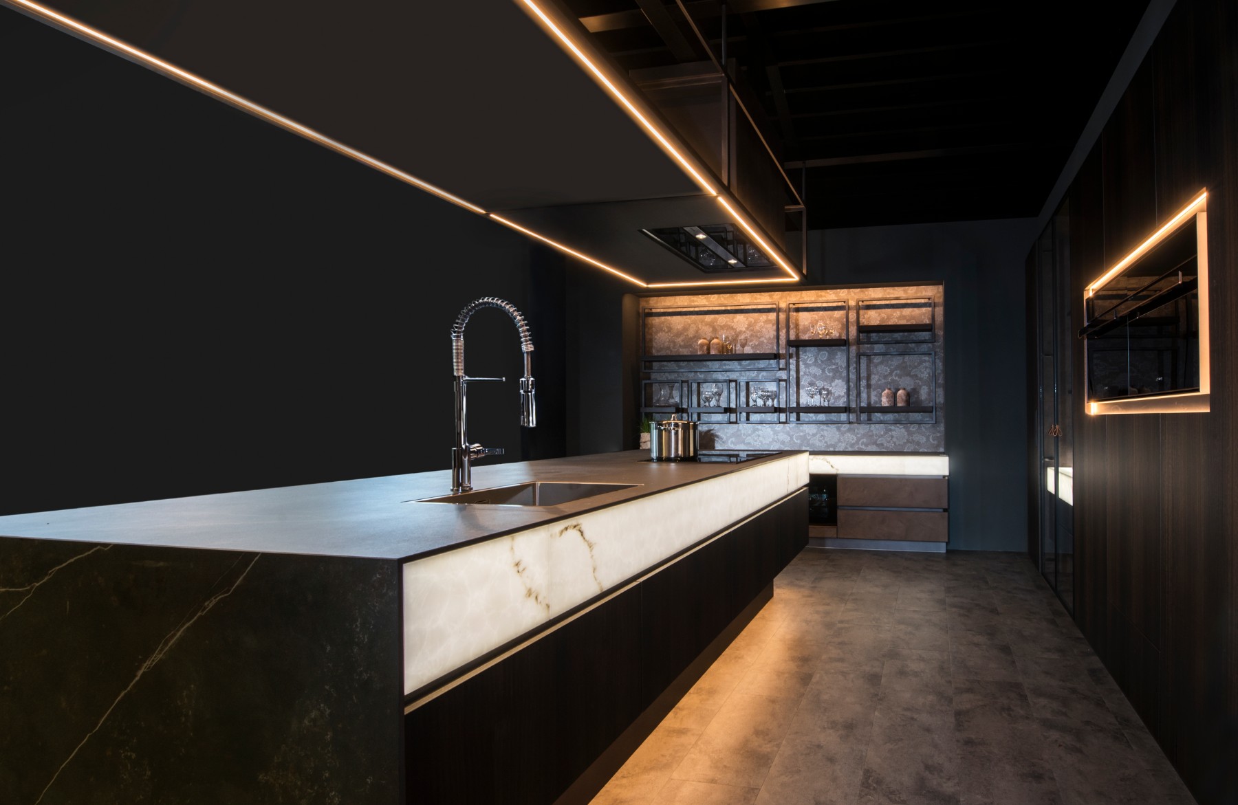 Bij deze keuken is gebruik gemaakt van verschillende natuurlijke materialen. De fronten zijn een combinatie van Eucalyptus fineer en een Chocolat Brown betonfront. Alle stalen elementen zoals het wandrek, de luifel met afzuigunit en de grepen zijn voorzien van een metaallak. De glaskasten zijn voorzien van lichtdoorlatende marmerlook achterwanden. De lichtdoorlatende Mereno Marble-light elementen, zowel in het eiland, de glaskasten als in het wandmeubel maken het geheel uniek en bijzonder. De combinatie met het Dekton blad "Kelya" en de Smeg apparaten met de bronzen accenten maakt het totaal tot een lust voor het oog!