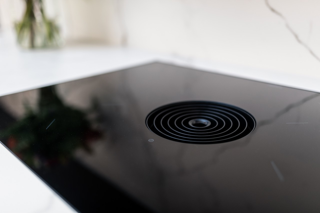In deze super strakke keuken zijn de witte fronten gecombineerd met een keramieken werkblad met matte afwerking.