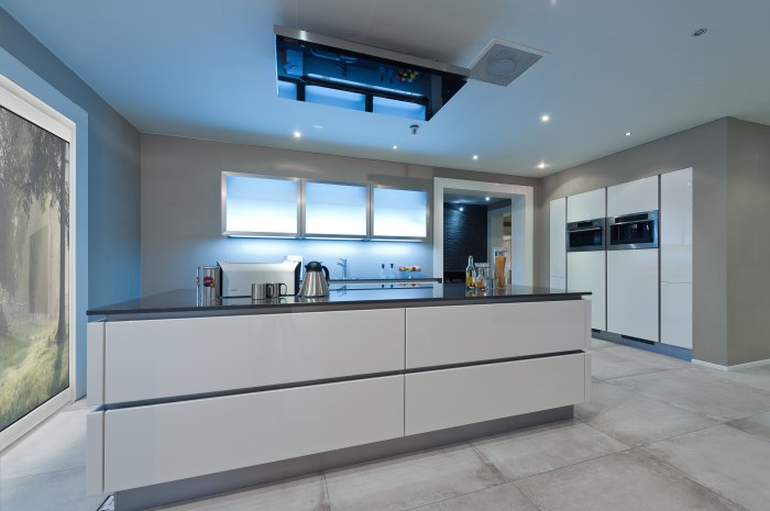 Deze grote greeploze keuken is een ware blikvanger in onze showroom en ademt luxe uit. De keuken heeft een composieten werkblad en is voorzien van een inductiekookplaat, plafond-afzuigunit, koelkast, vrieskast, vaatwasser, combimagnetron, koffiemachine, grote laden en prachige glasklepkasten met ledverlichting.