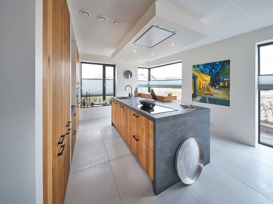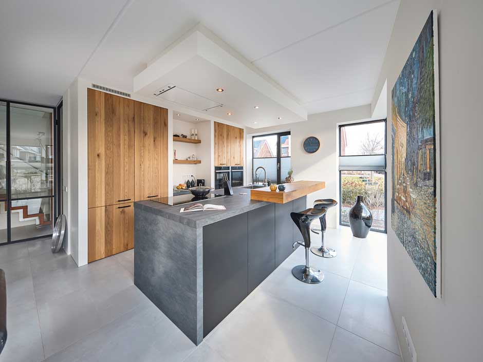 Het is logisch, dat je niet met je rug naar de kamer toe gaat staan aan het eiland. Dus komen de kraan en de kookplaat in het verlengde van de woonkamer, met het uitzicht op de weidse laan.
