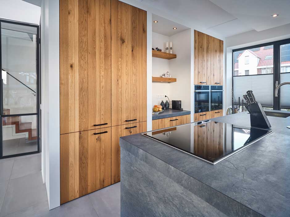 De houten fronten zijn modern en warm. Eiken is een populaire houtsoort dat een warme sfeer verspreidt. Heel lichtjes zie je de nerf lopen maar het blijft subtiel.