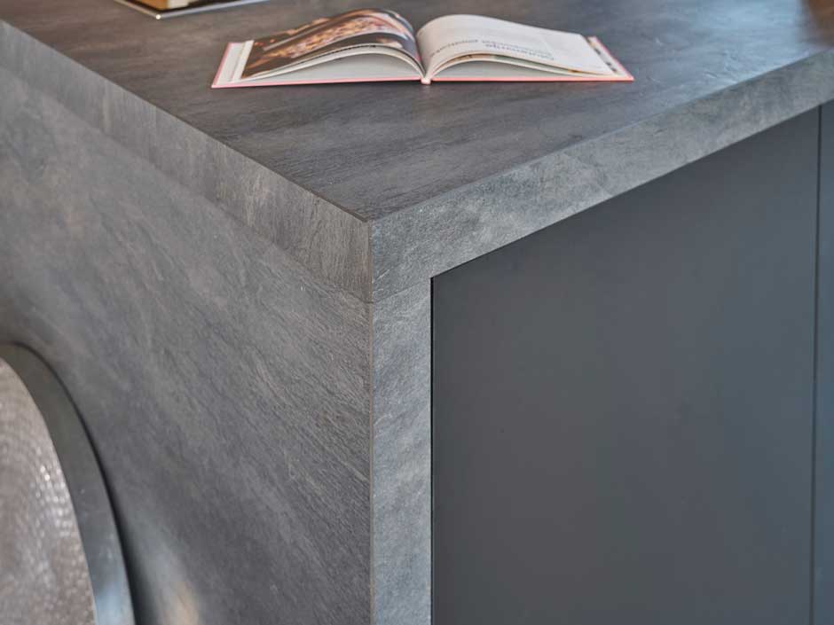 In het eiland is ruim voorzien in opbergmogelijkheden. Achter elk front zitten kasten en lades, je kunt met gemak je spullen kwijt. Werkruimte wilden de bewoners extra, daarom is de kastwand onderbroken met een keramiek werkblad. Dat vinden ze fijn.