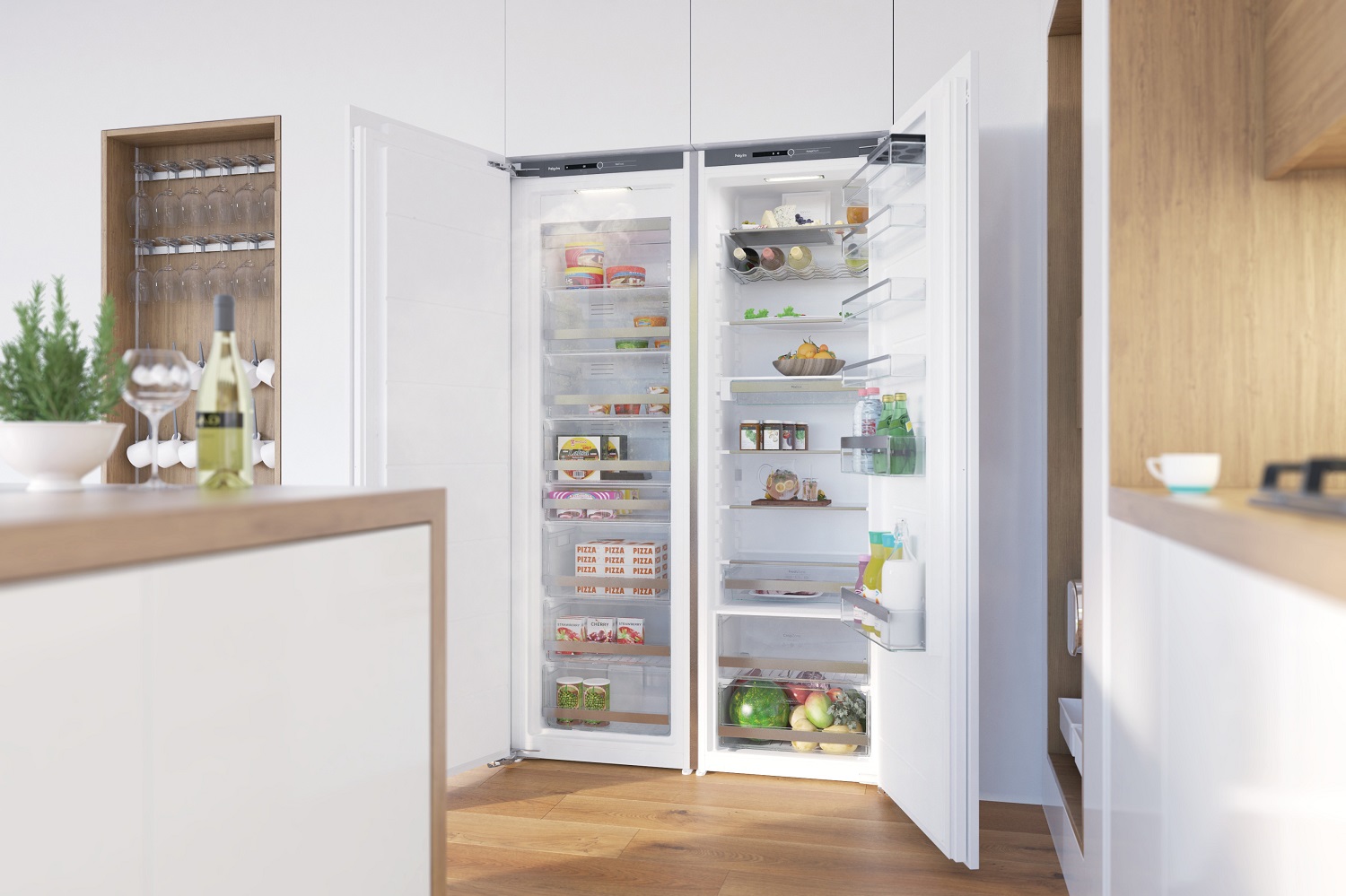 Eén ding is zeker: deze keuken weet absoluut een grootse entree te maken. Laten we beginnen met het ontwerp. Naast een groot kookeiland zijn er alleen vrijstaande hoge kasten voor de koelkast en oven. Ernaast werd een groot open rek geplaatst, dat zowel puur decoratieve elementen als de dagelijks gebruikte keukenspullen in keramiek bevat. Deze indeling zorgt ervoor dat de keuken een markante en tegelijkertijd vrij luchtige look krijgt.