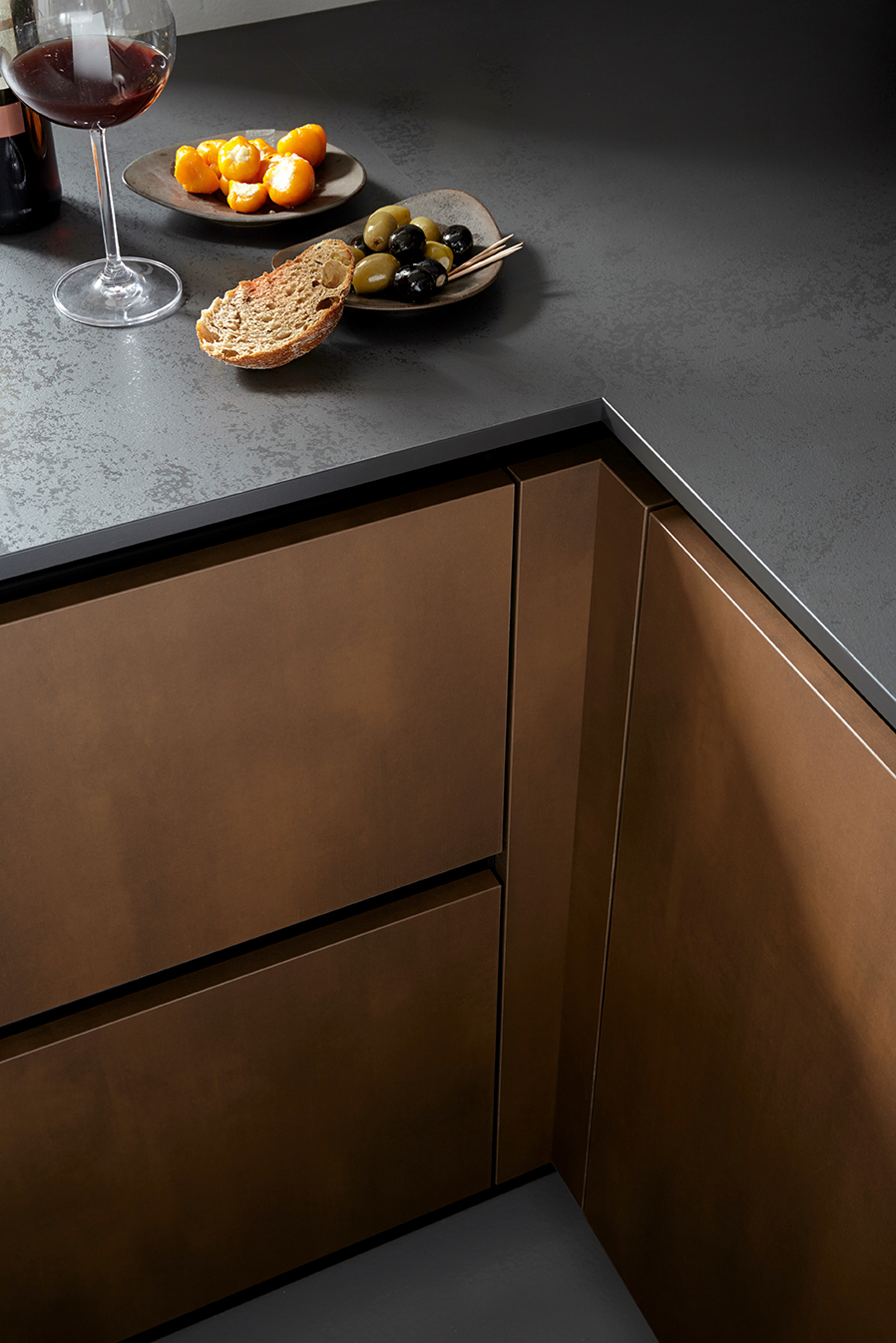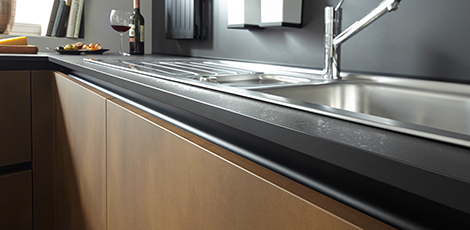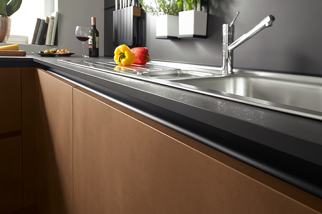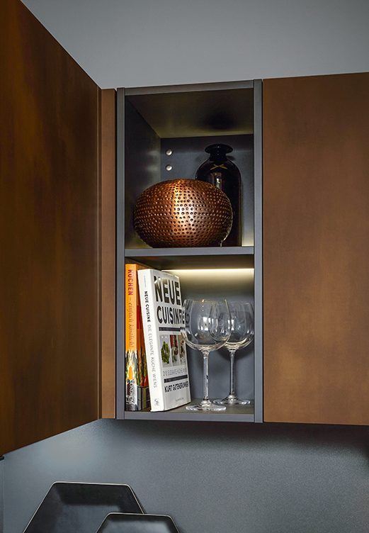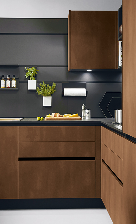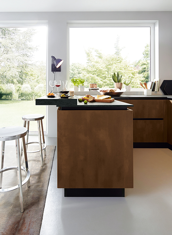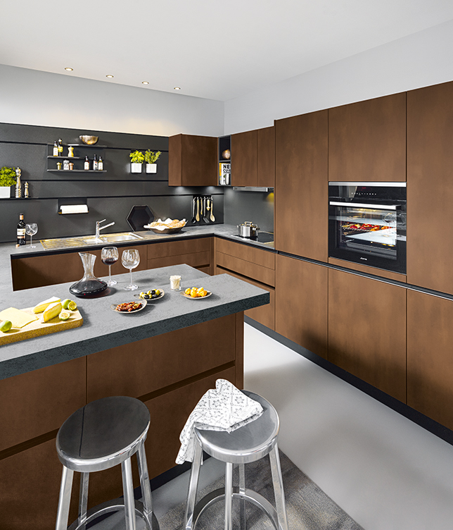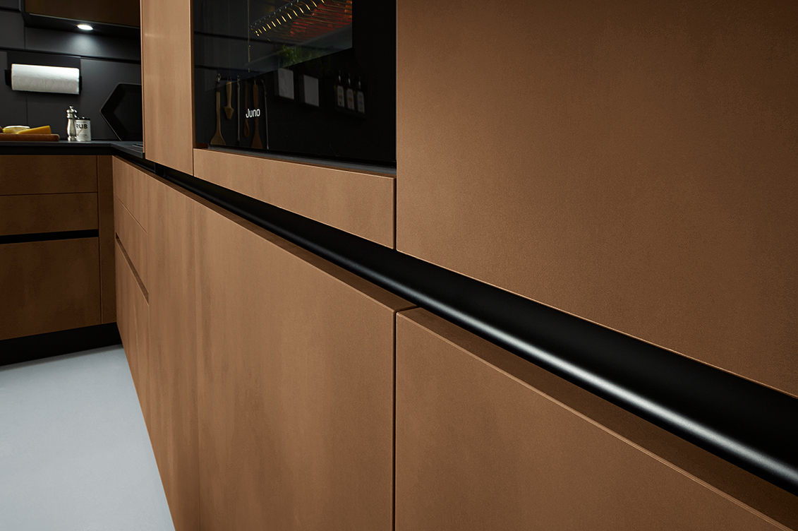 Deze greeploze Schüller keuken is een keuken die uitgevoerd is in staal brons imitatie. Een frontkleur die perfect past bij zwart.
