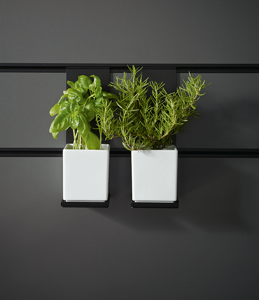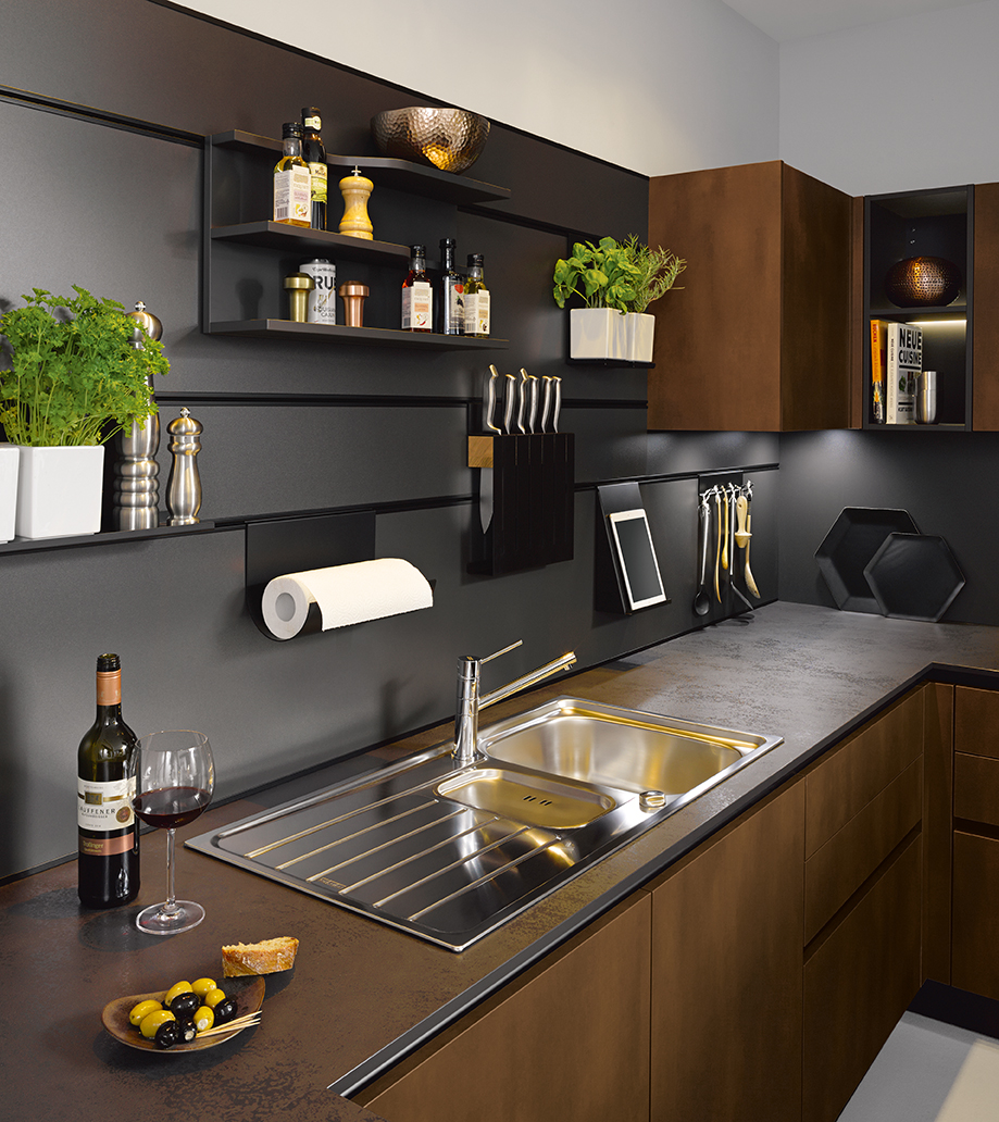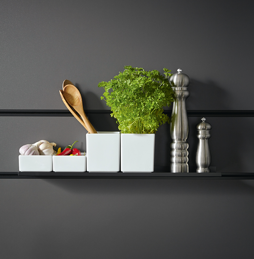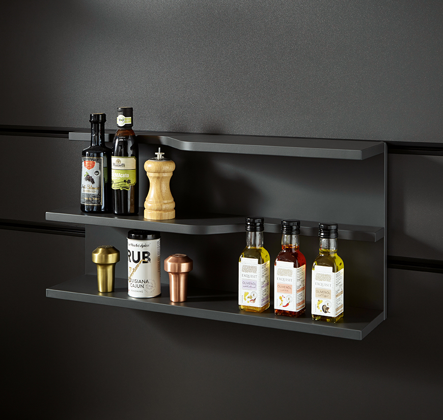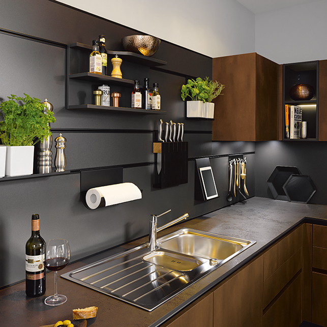 Bijzonder in deze keuken is het nispaneel-systeem en accessoires in alu onyxzwart. Aan dit systeem kunnen verschillende elementen op een speelse manier opgehangen worden. Zo kan het paneel helemaal naar eigen wens ingericht worden. Maak ruimte voor bijvoorbeeld keukengerei, een keukenrol of misschien wel de tablet om gemakkelijk een recept te lezen tijdens de voorbereiding van het diner.