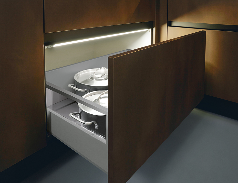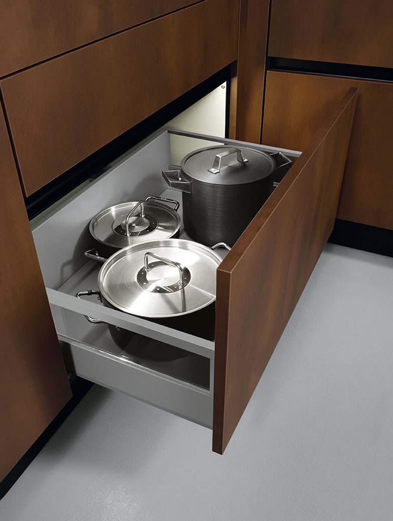 Ook zijn in deze keuken de handige flex-boxen gebruikt. Met deze flex-boxen voor lade en uittrekelementen kunnen spullen netjes in de kasten opgeborgen worden. Door alles netjes op te bergen ziet het er overzichtelijk en geordend uit en blijft alles netjes op zijn plaats liggen en staan. Het grote voordeel van een geordende indeling is de vaste structuur waardoor het opvalt wanneer een product weer aangevuld moet worden.
