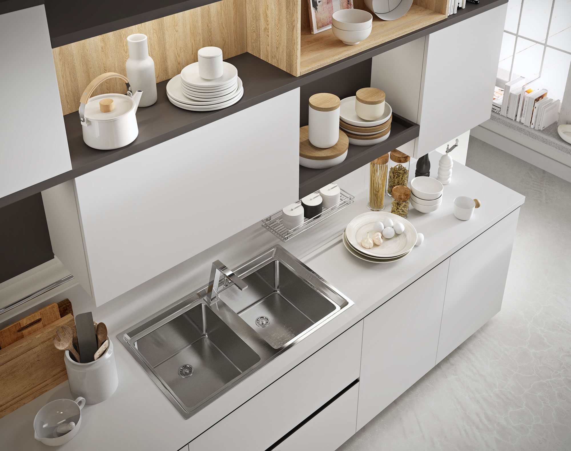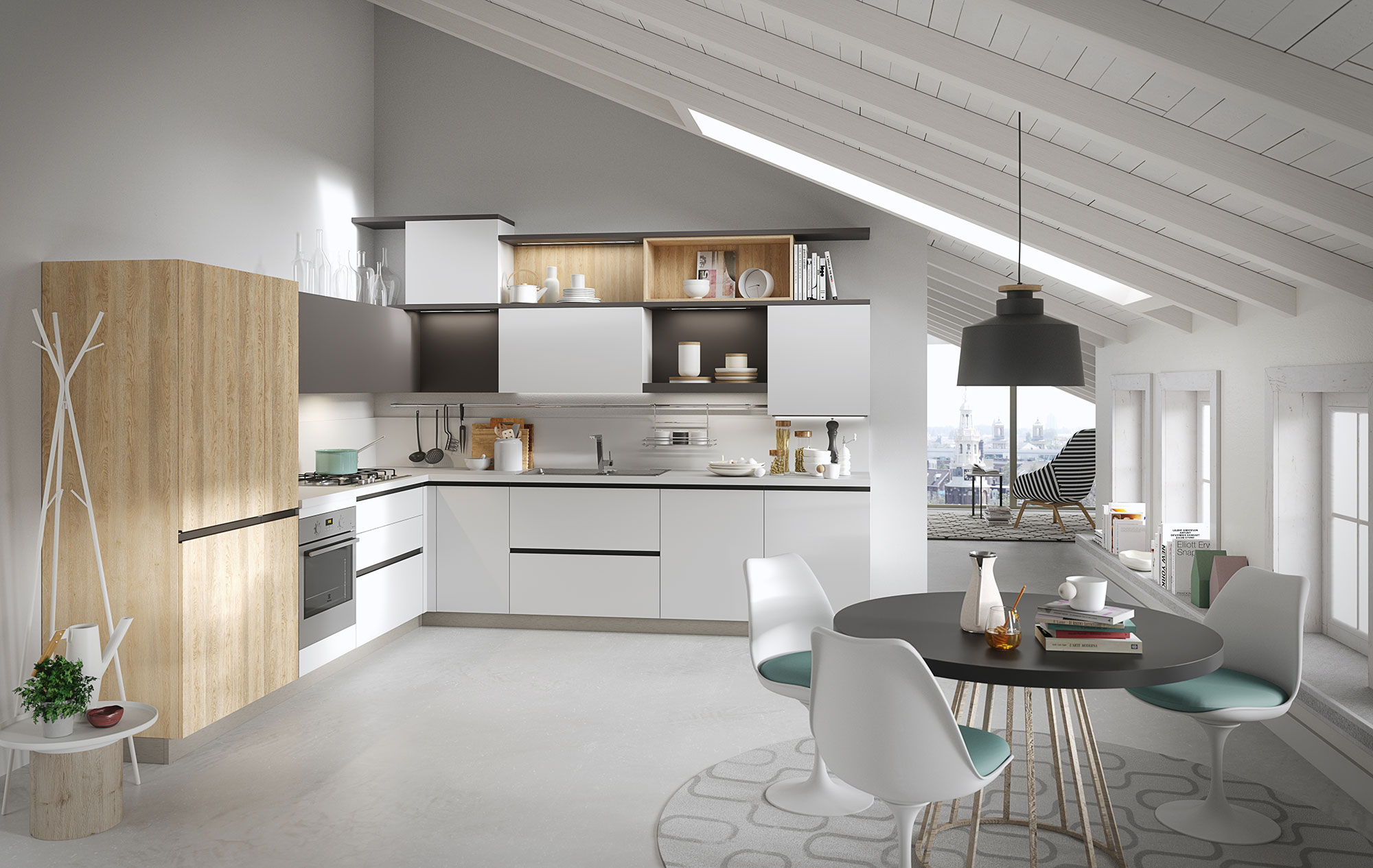De minimalistische elegantie van deze Snaidero Joy keuken vat de essentie van de moderne keuken samen: eigentijds design, aandacht voor detail en veerkracht. Een gestroomlijnd uiterlijk met ruimtelijke keukenoplossingen.