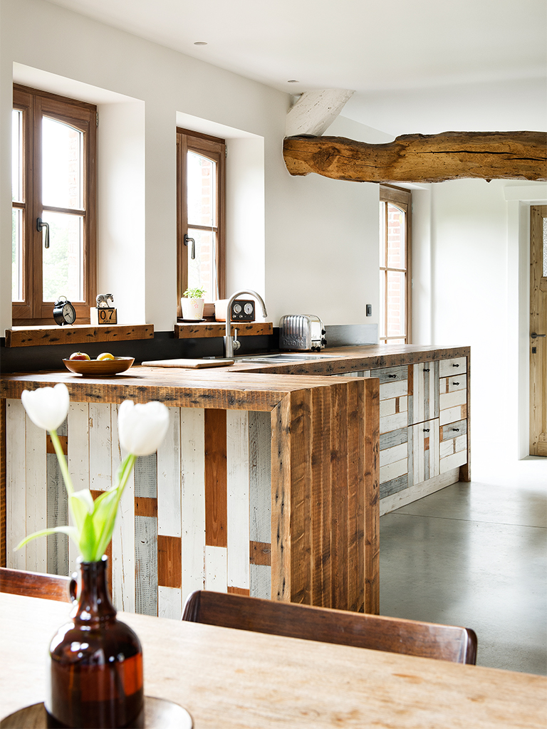 Deze RestyleXL-keuken wordt gemaakt van sloophout en oud hout. Wat ooit plafondbalken en vloerplanken waren, is nu een prachtige nieuwe keuken.