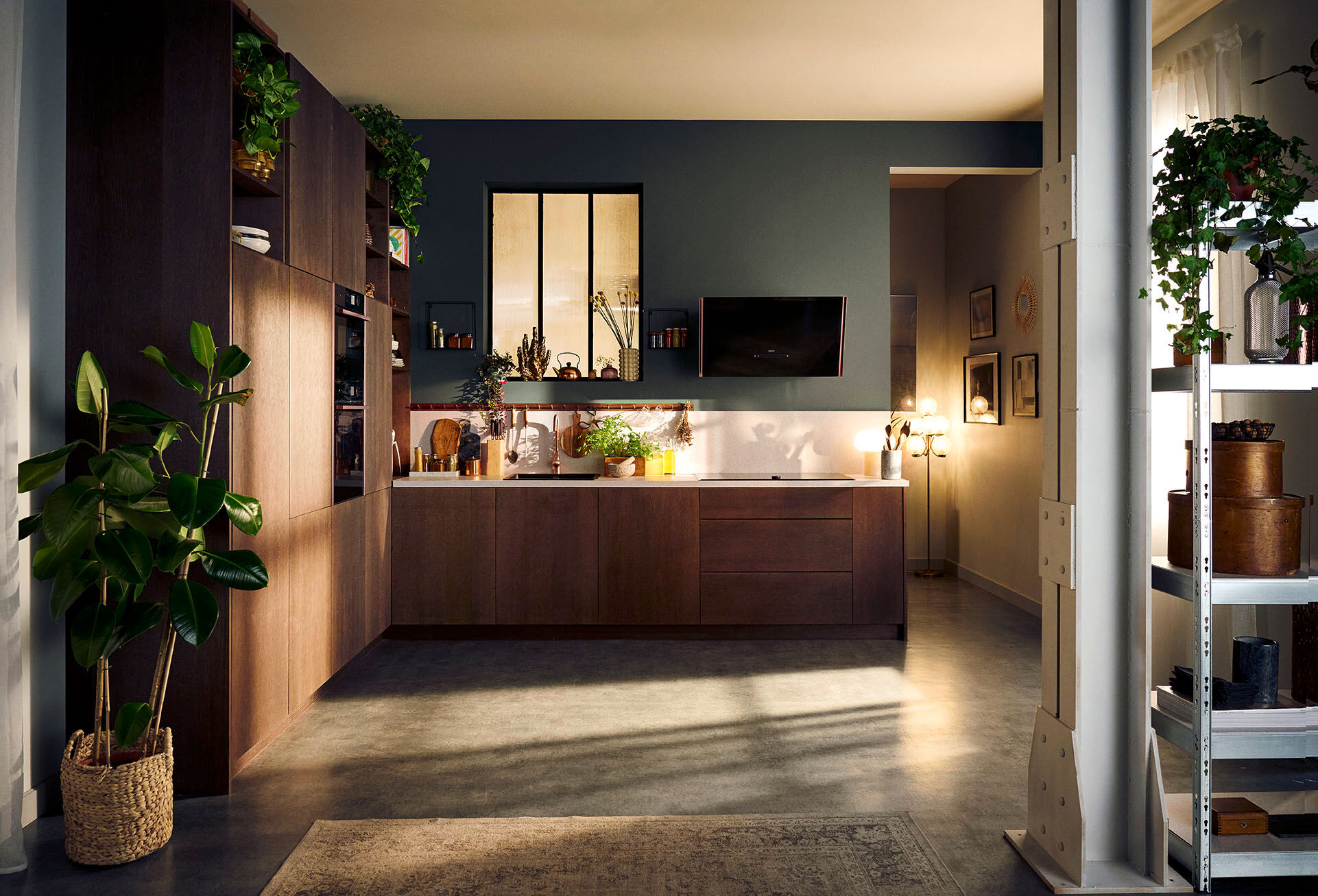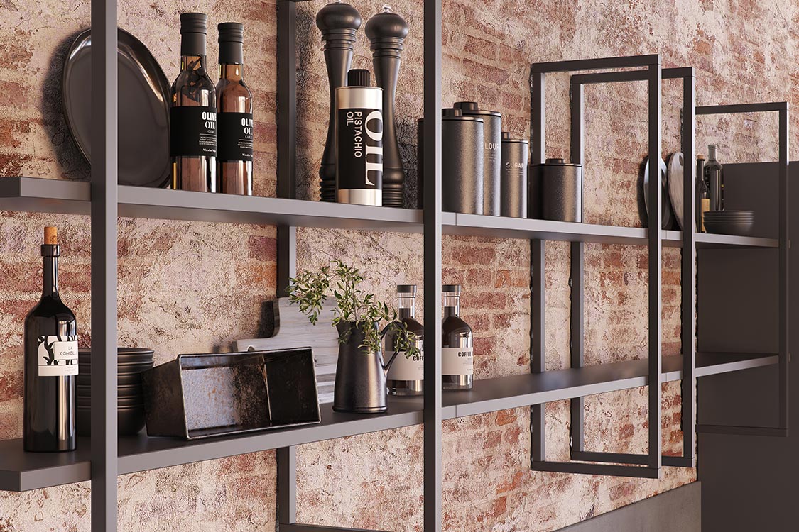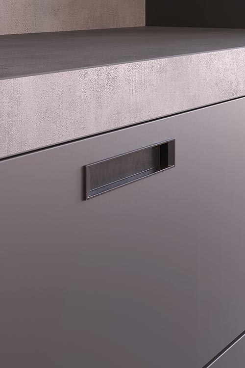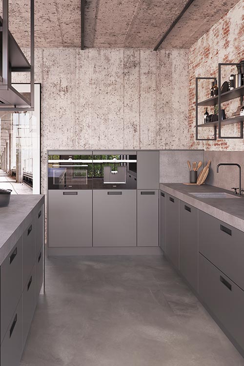 Steen en staal vormen de basis van deze hyper-industriële keuken. Het eiland is volledig ingepakt met keramiek. De fronten in grafiet structuurlak en de afzuigkap in metalen frame maken het plaatje compleet.