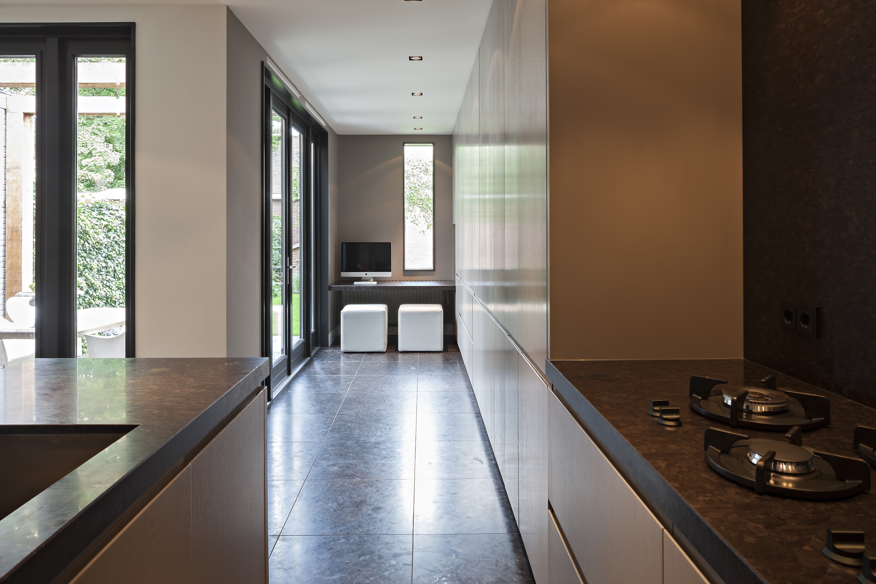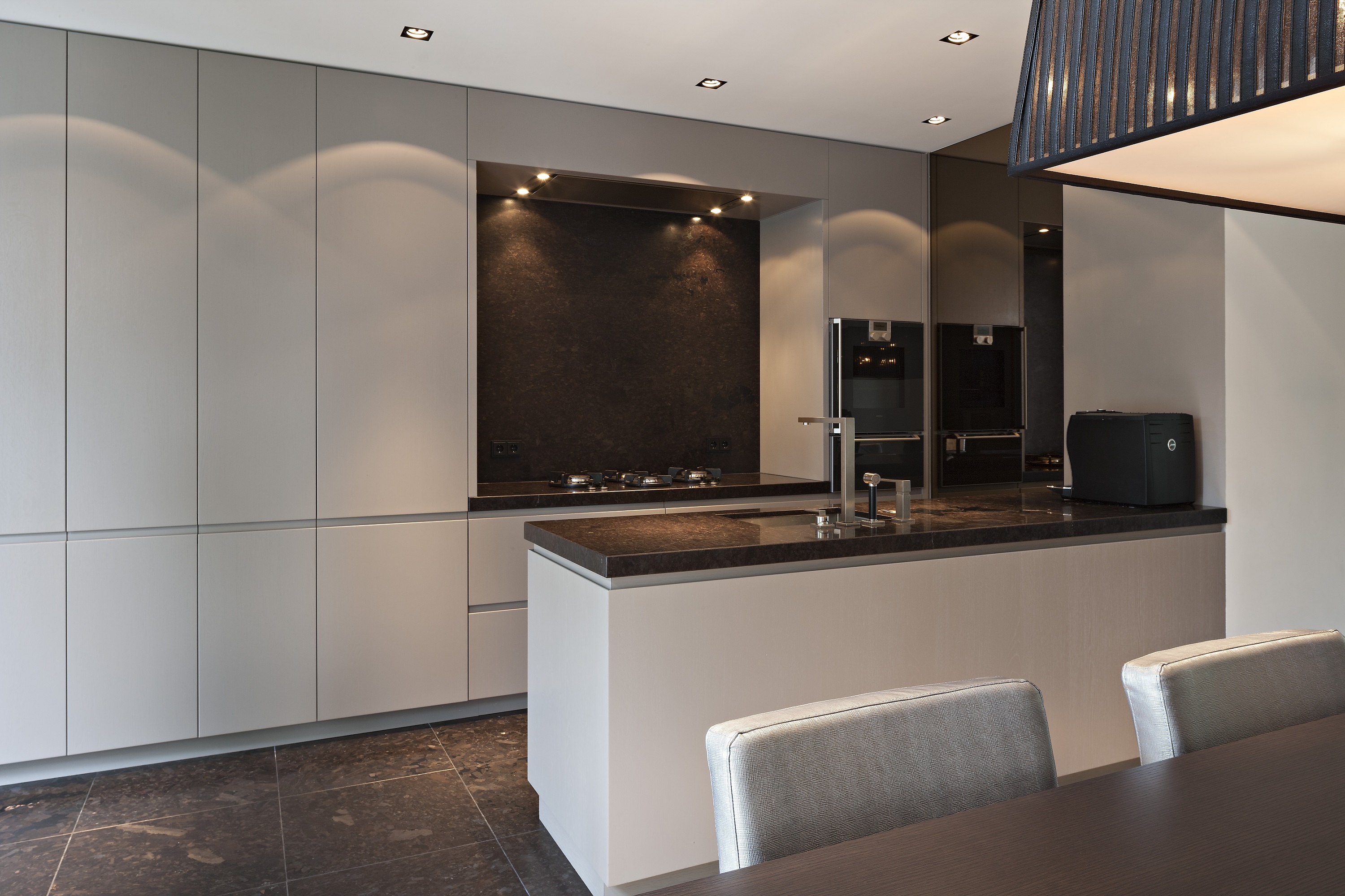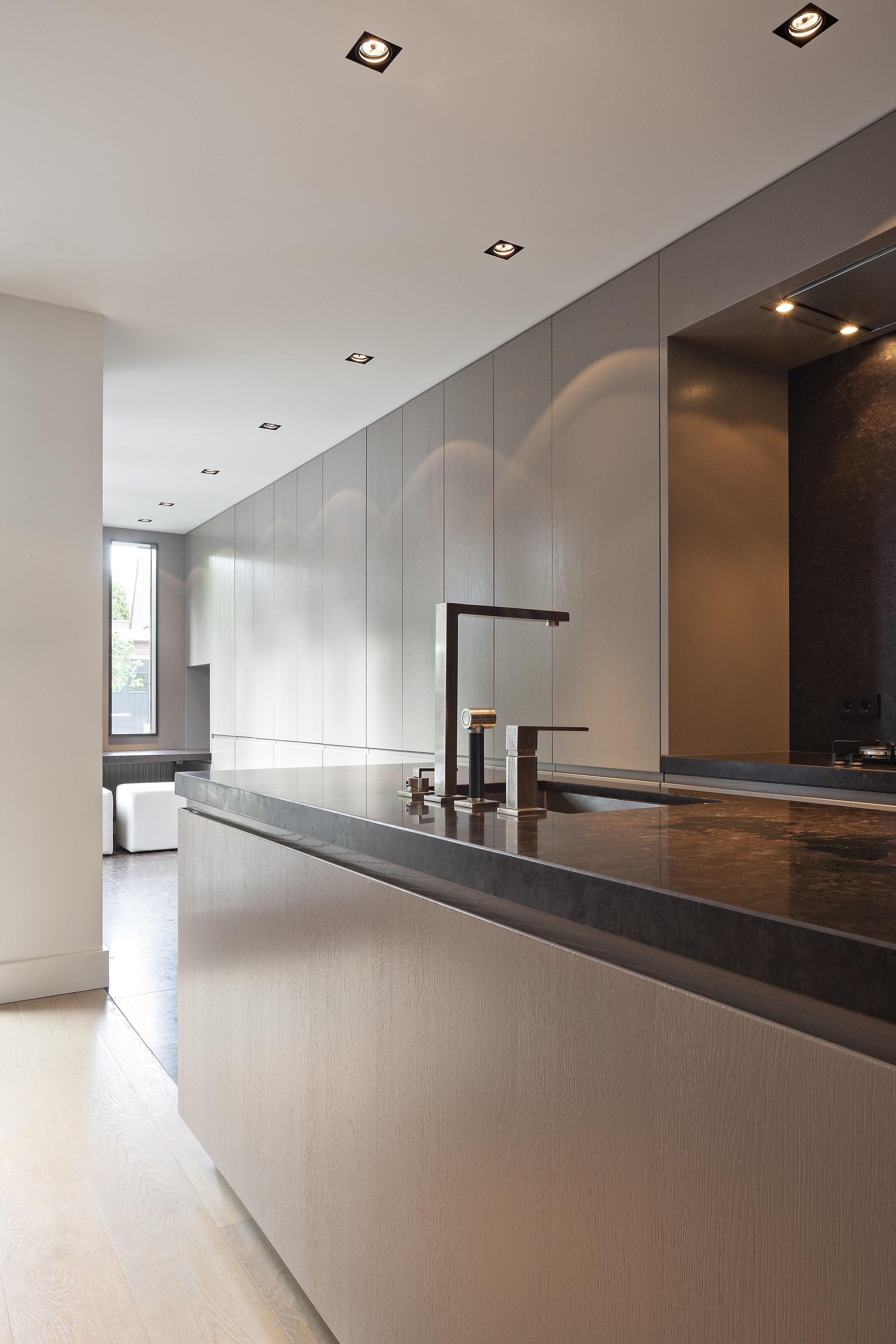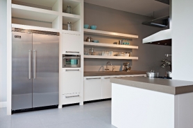 Je zou het 'fusion design kunnen noemen, het momenteel zeer populaire combineren van verschillende stijlen tot een karaktervol geheel. Het is één van de specialiteiten van Paul van de Kooi Keukens op maat BV om over de grenzen van traditionele stijlen te denken. En dan gaat er een wereld aan mogelijkheden open: een robuuste keuken van massief eiken met een betonnen werkblad. Het beton wordt in eigen beheer en ter plekke gestort dus geen naden. Bovendien is het betonnen werkblad door een uniek recept vrijwel vlekvrij. En in deze tijdloze keuken mag de hoogwaardige kookapparatuur uiteraard gezien worden!