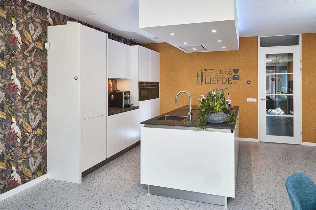 In de koffiecounter loopt het behang ook door. Hierdoor integreer je de keuken met het woongedeelte.