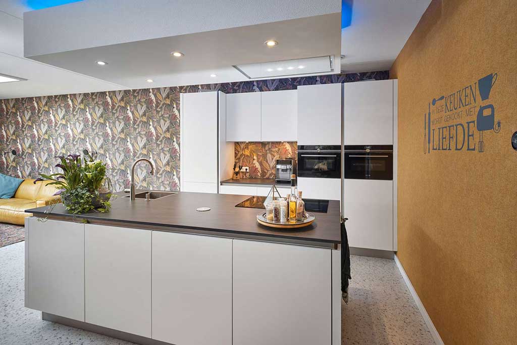 Deze mat witte greeploze keuken heeft dat. De opstelling triggert om met elkaar in en rondom de keuken te gaan staan of om mee te helpen.