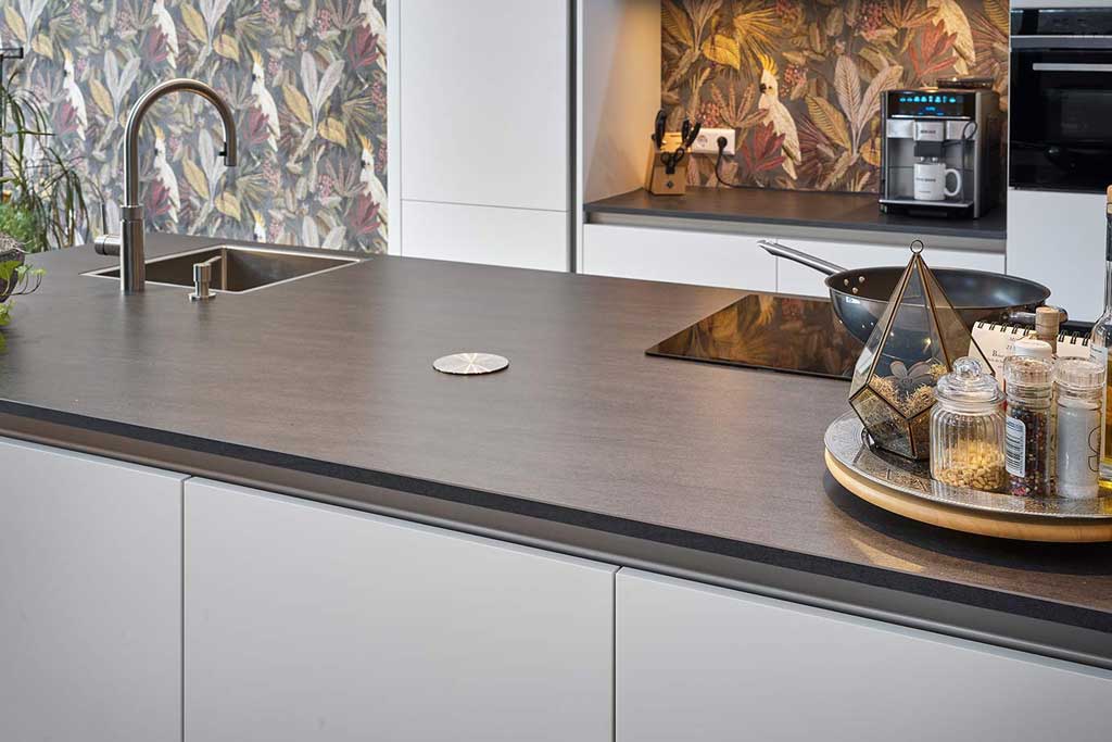 Een greeplijst bovenop een keukenfront zorgt er ook voor dat er ruimte ontstaat tussen de keukendeur en het werkblad. Hierdoor lijkt het aanrechtblad te zweven, heel fraai.