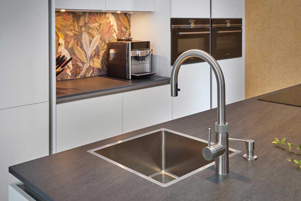 De keuken is modern en strak maar het verlaagde plafond maakt het knus en zet de keuken in de ruimte apart. Het is echt een domein waar je heerlijk in kokkerelt als waar je met elkaar bijpraat. Deskundig ontworpen.