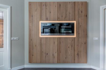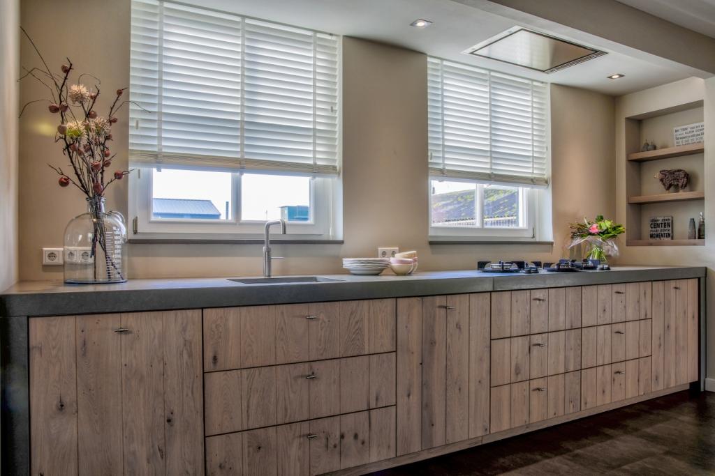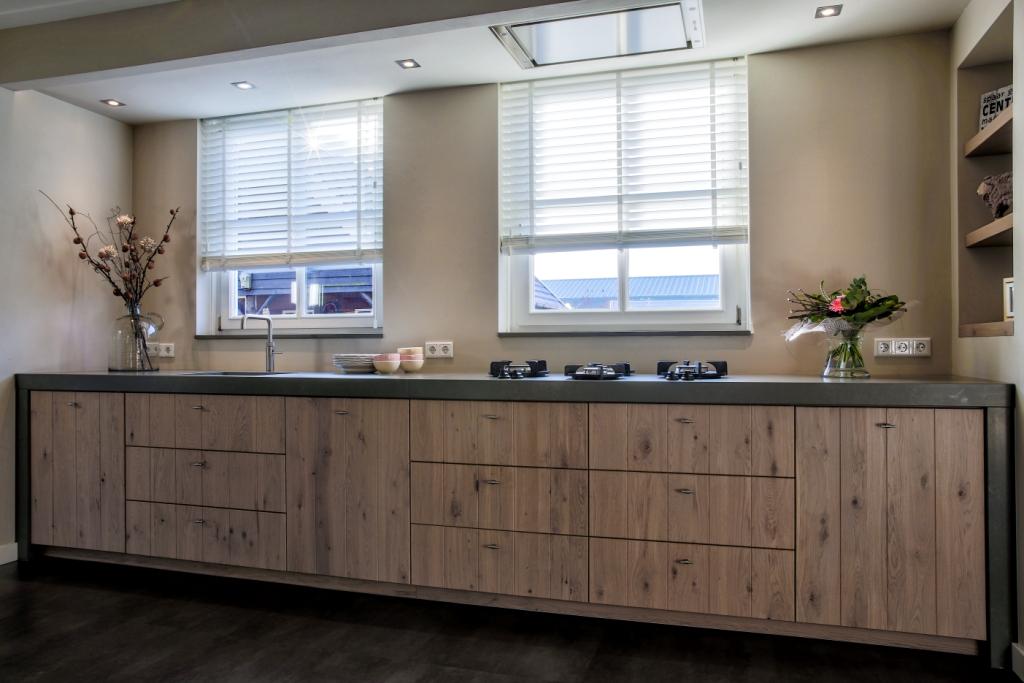 Stoere keuken met massief eiken fronten. De afzuigunit is weggewerkt in een koof waard je zelfs voor het raam kunt koken.