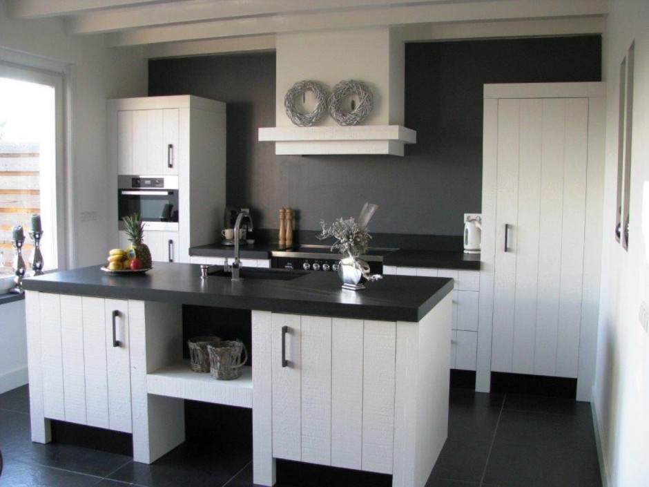 Een prachige houten keuken met zwarte accenten. Echt een keuken van deze tijd.