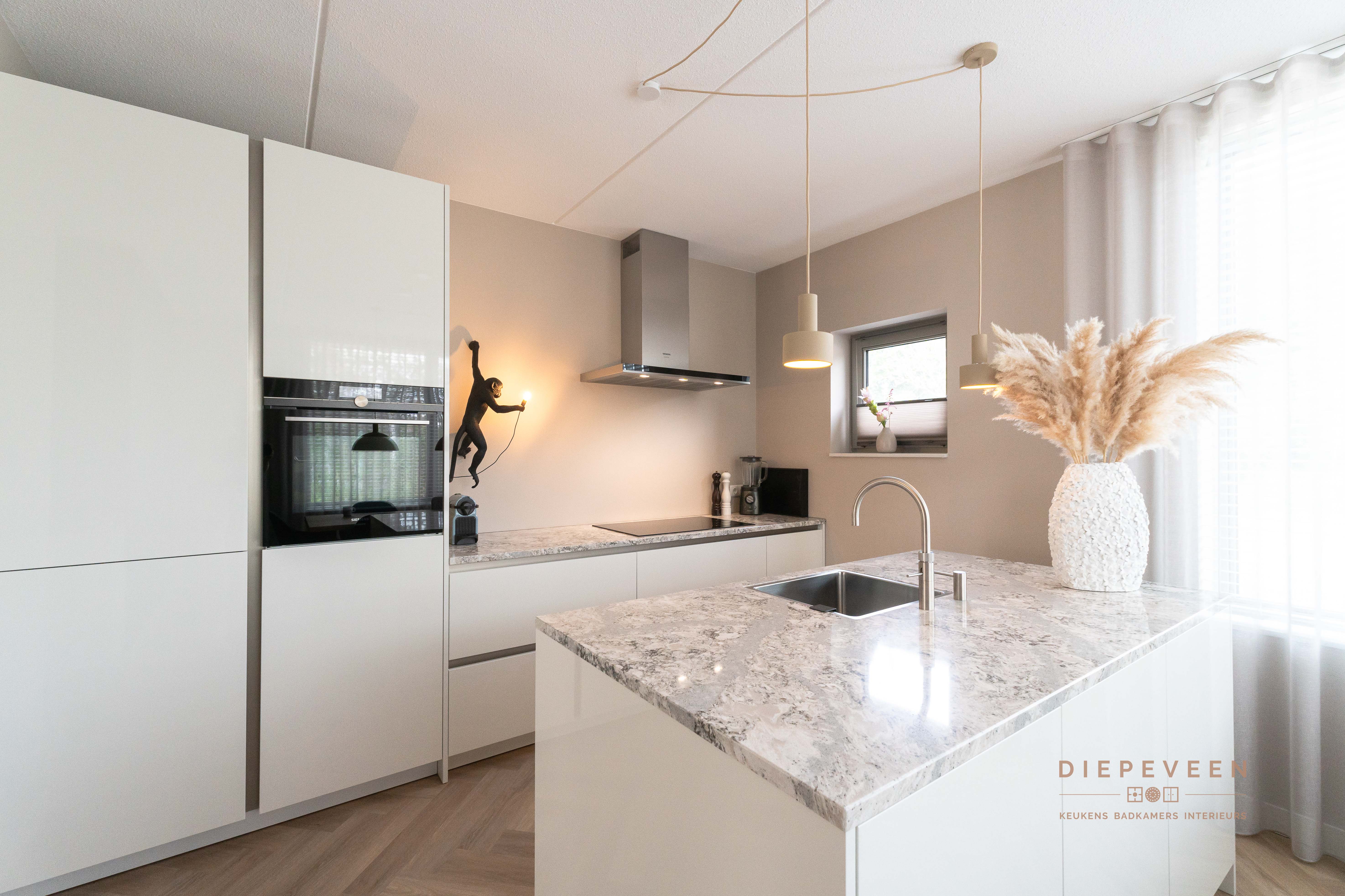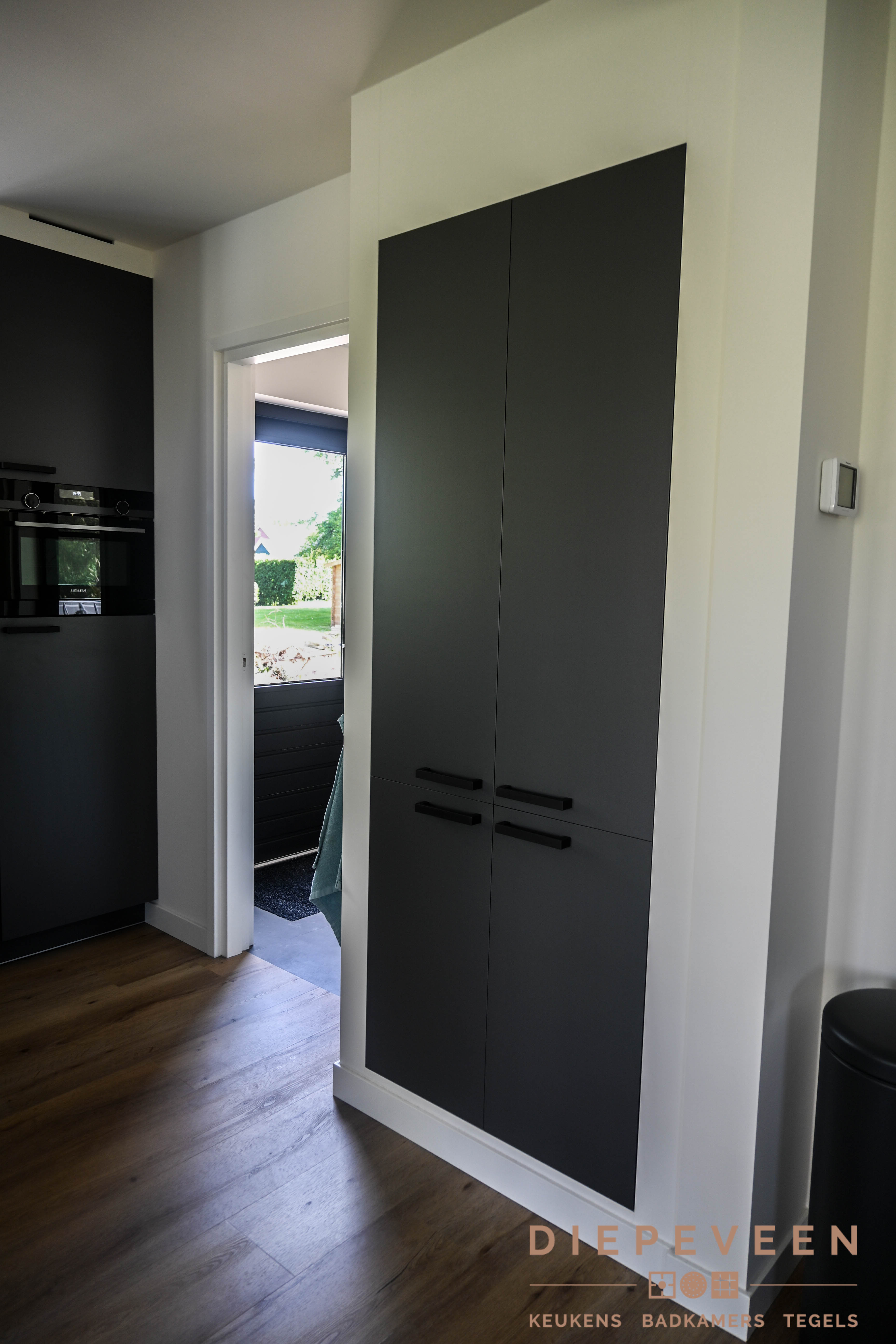 Een moderne hoekkeuken met zwarte accessoires. De houten vloer geeft de keuken een warme uitstraling.