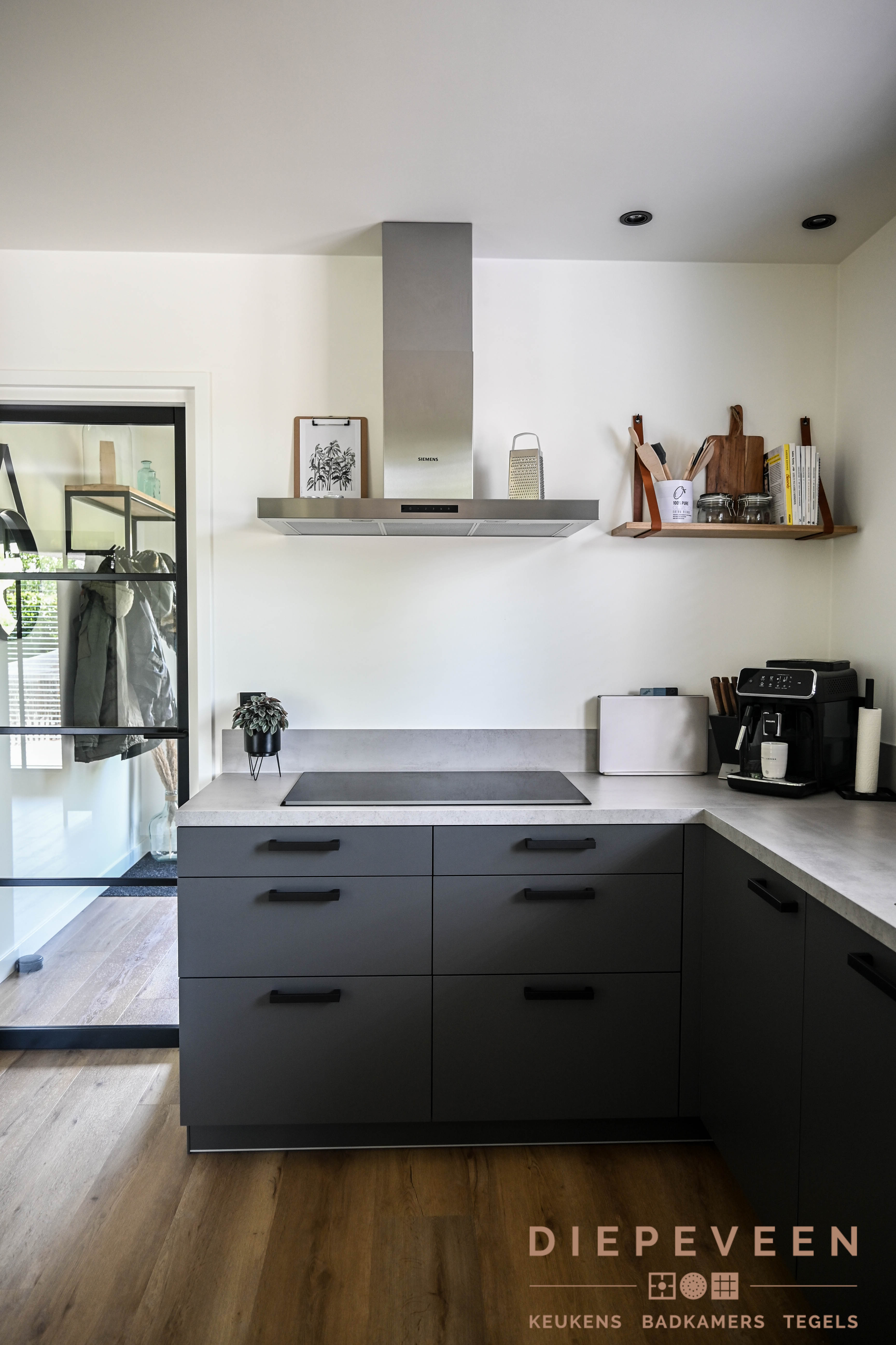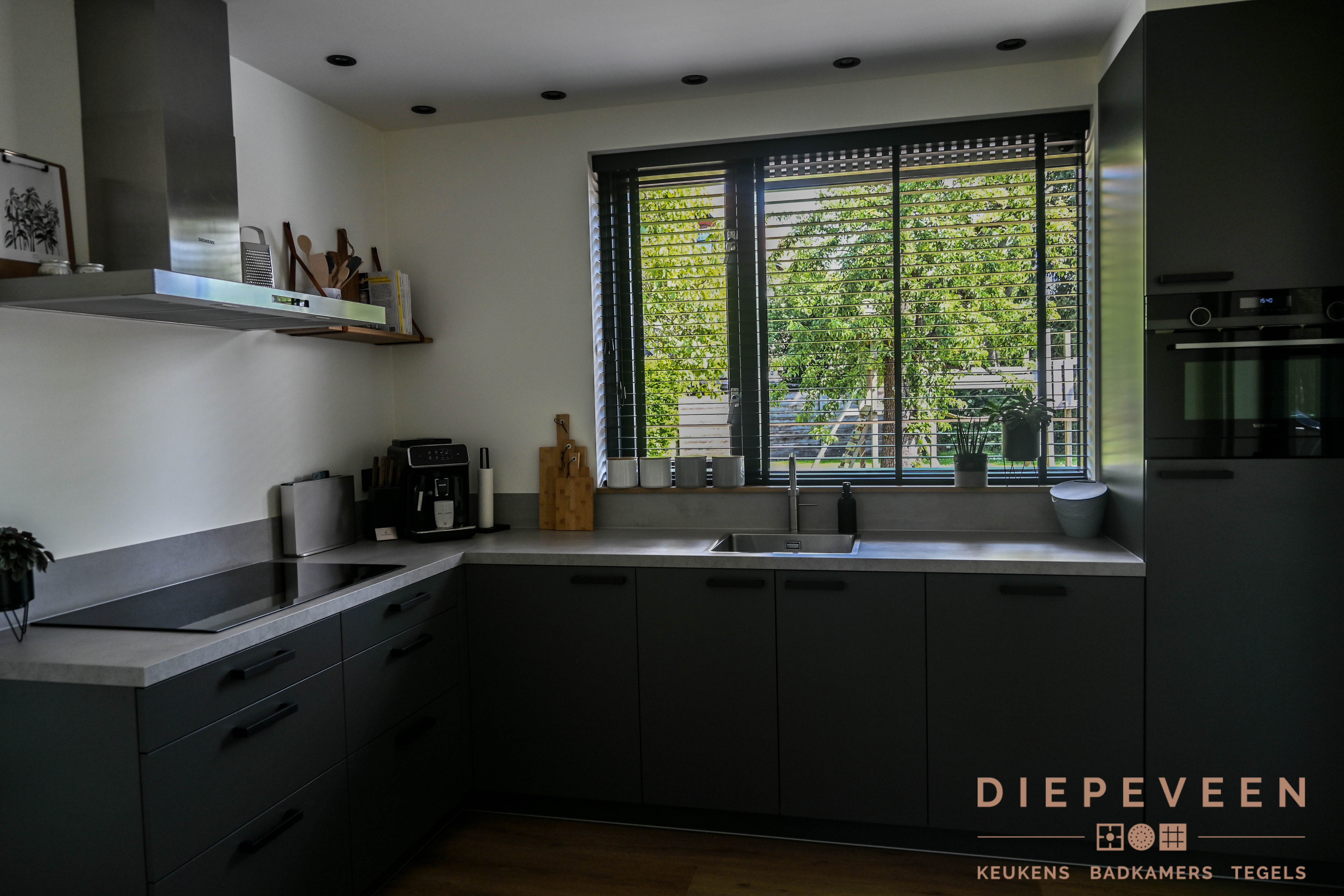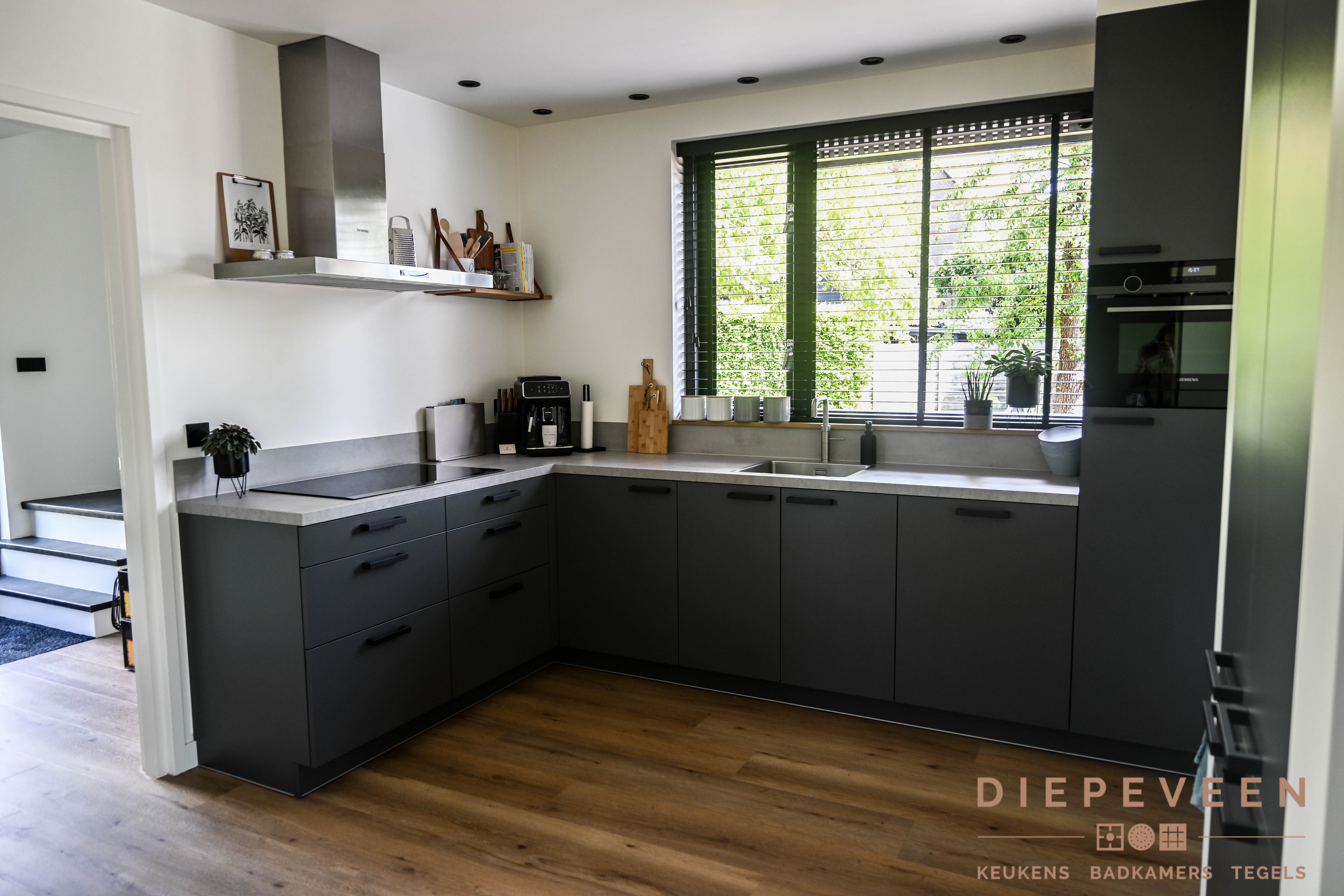 Een moderne hoekkeuken in een grijze kleur en een betonlook werkblad. Afgewerkt met zwarte greepjes.