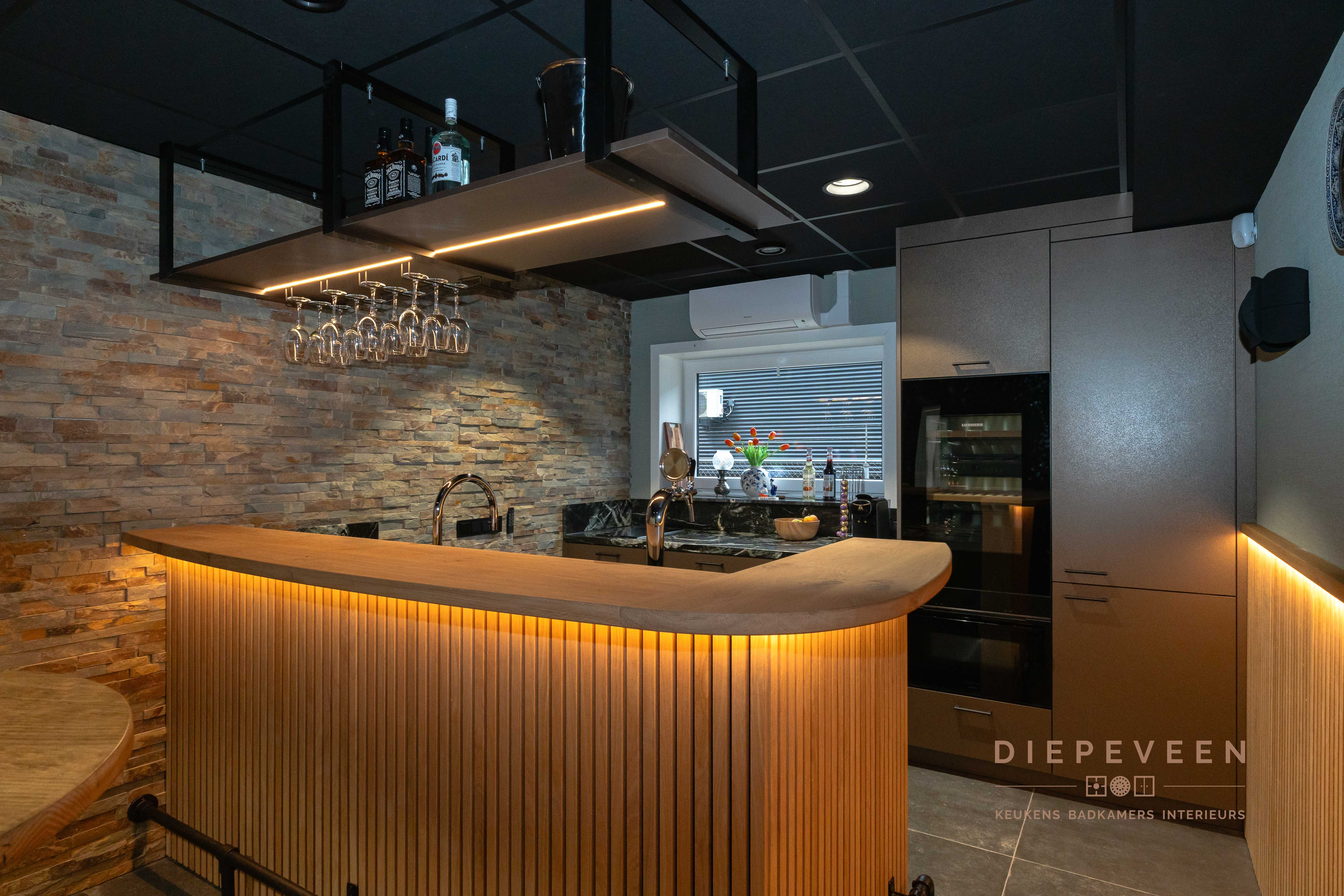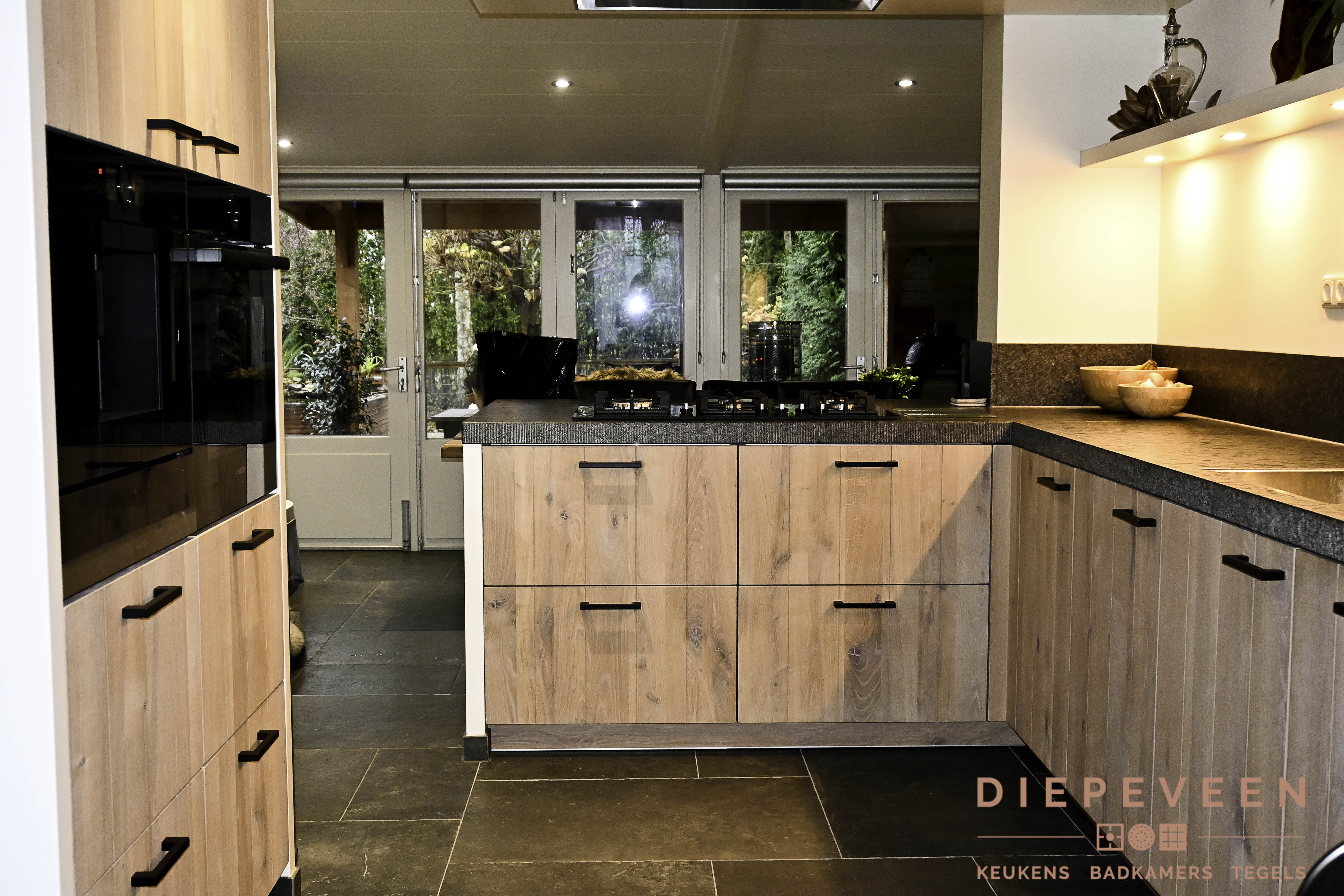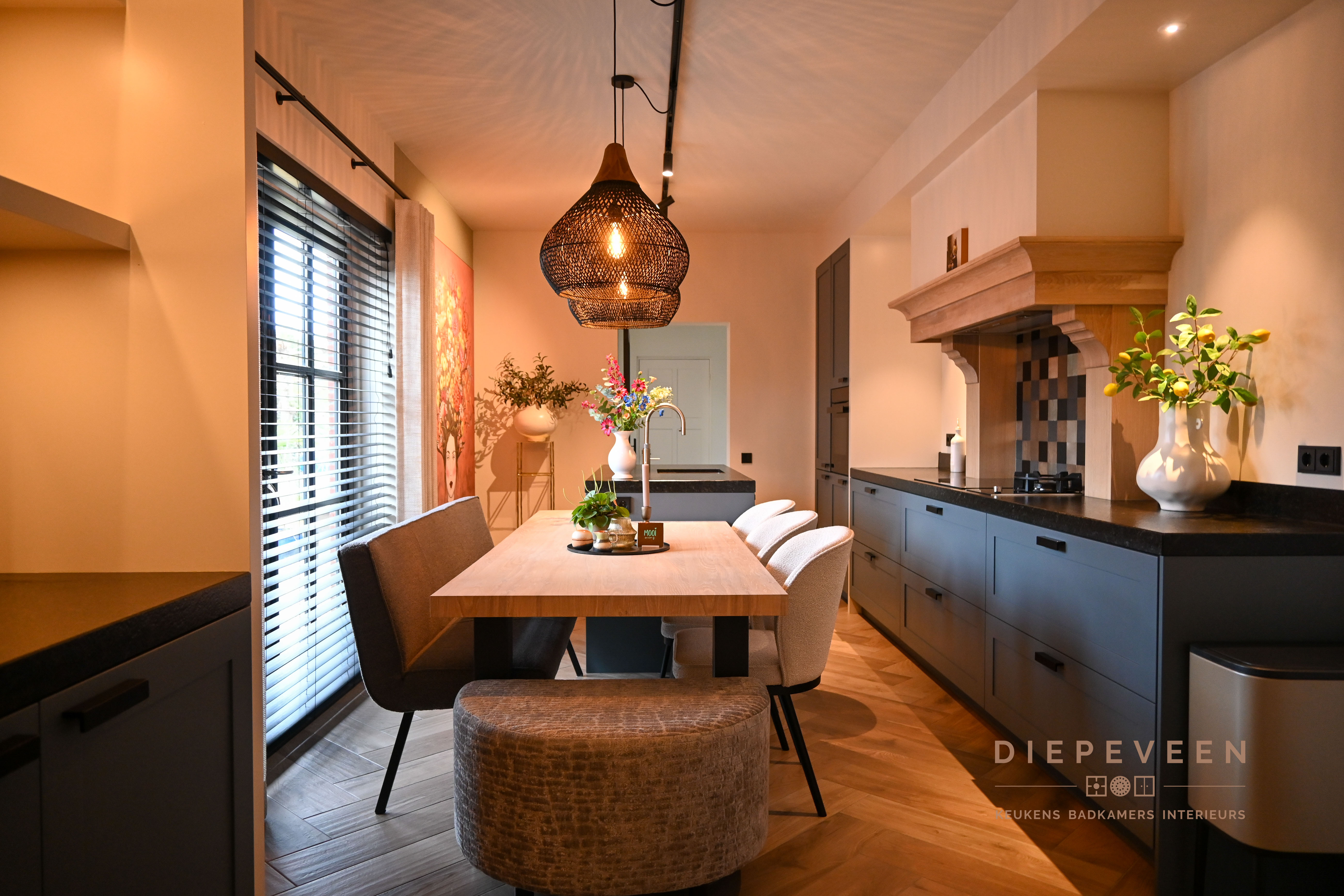 Landelijke keuken met een zwart werkblad en houtlook fronten