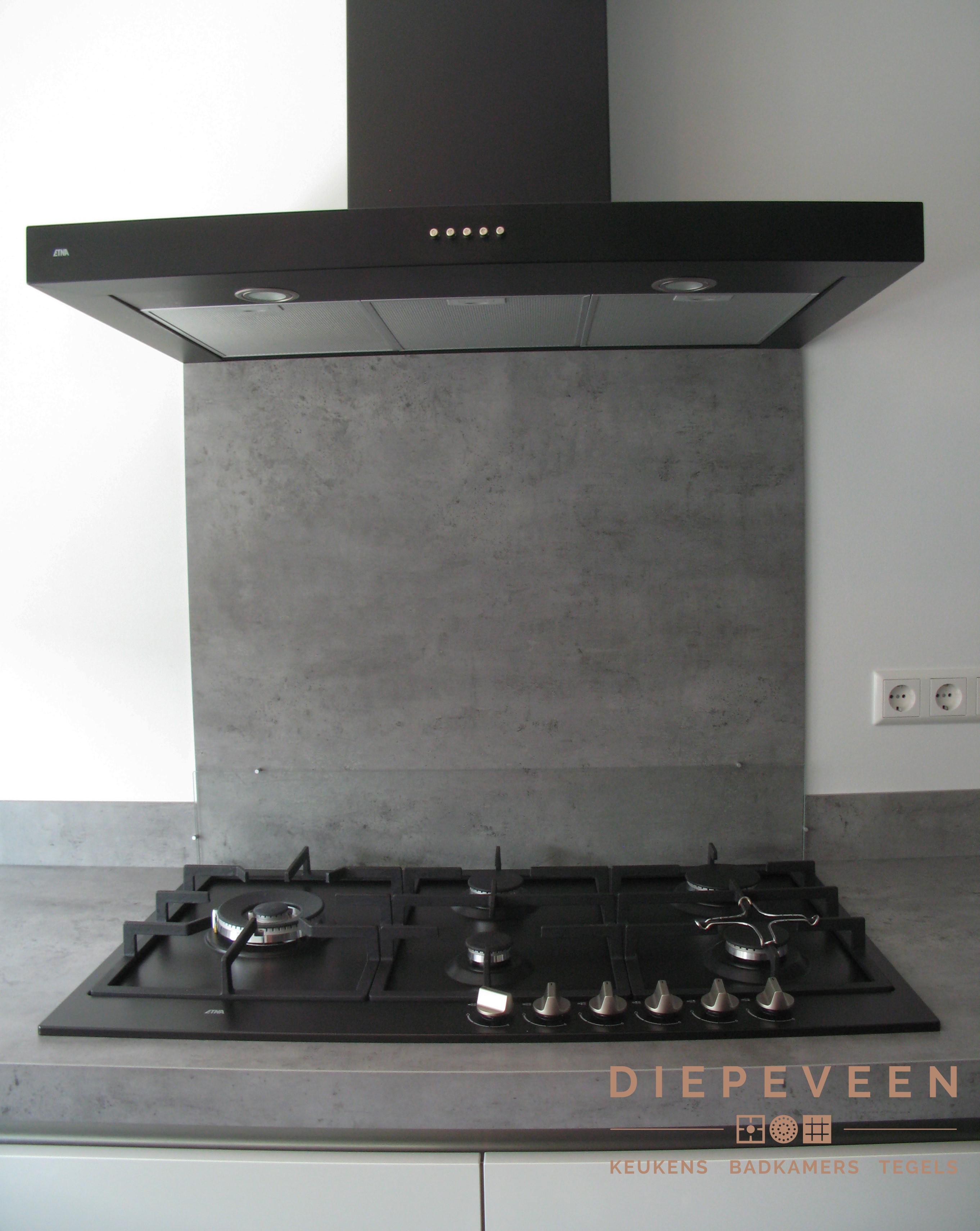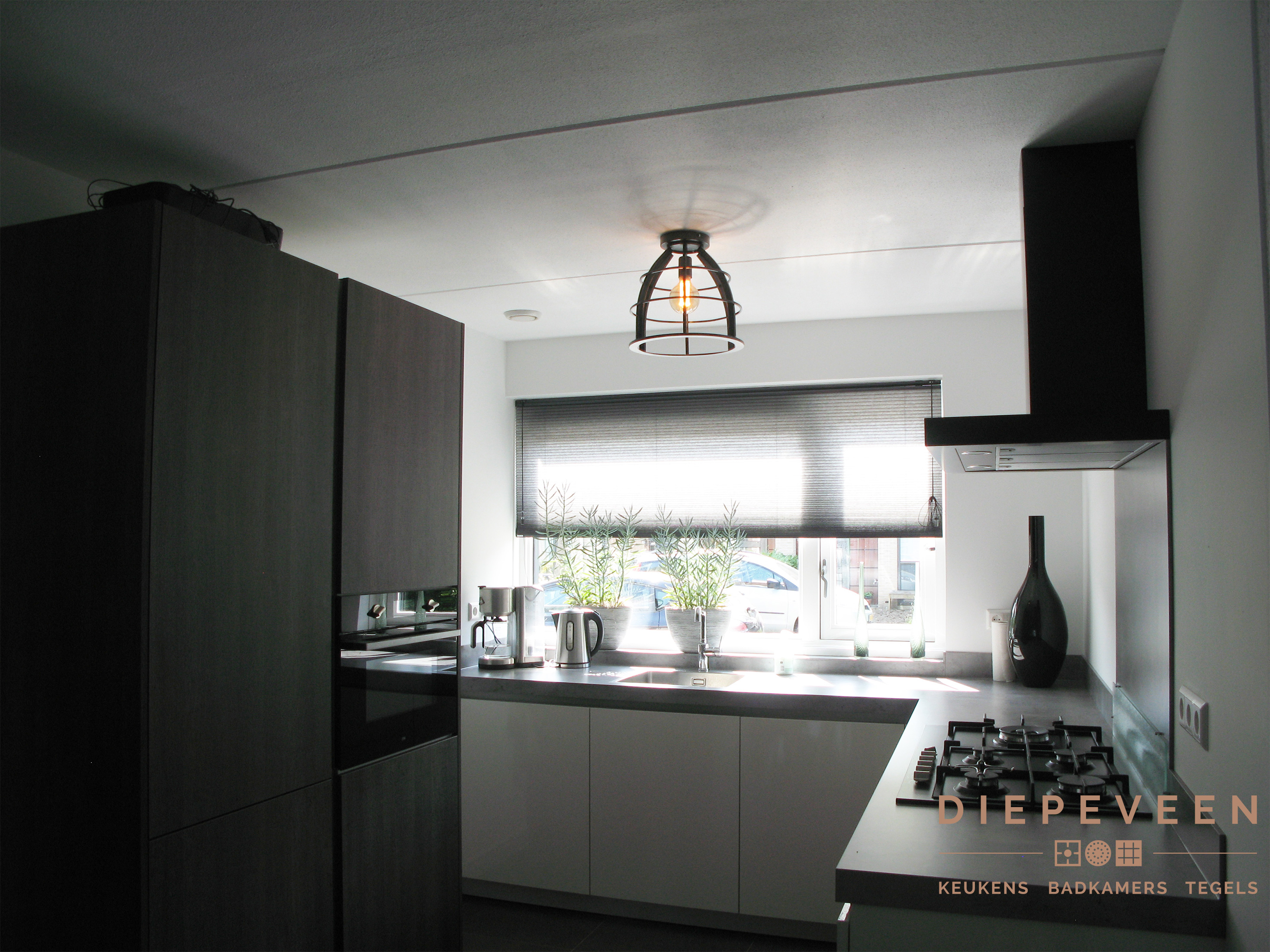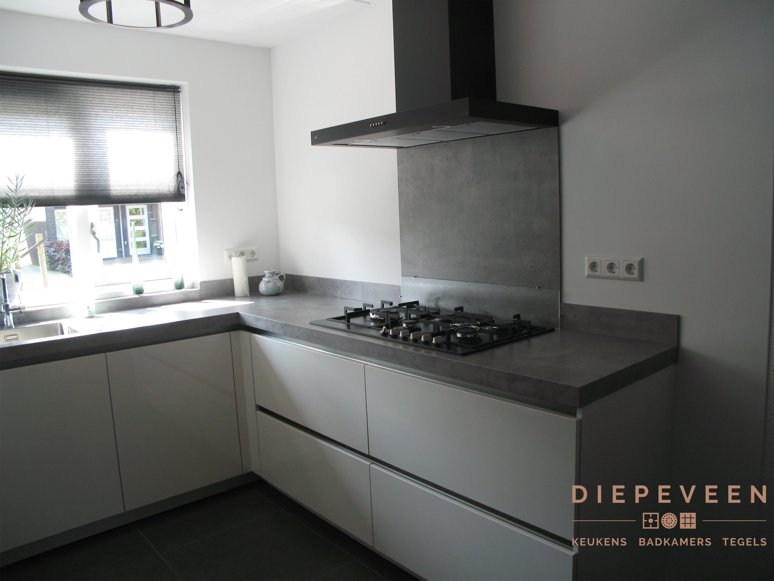 Een prachtige moderne hoekkeuken. De zwarte afzuigkap komt hier goed tot zijn recht!